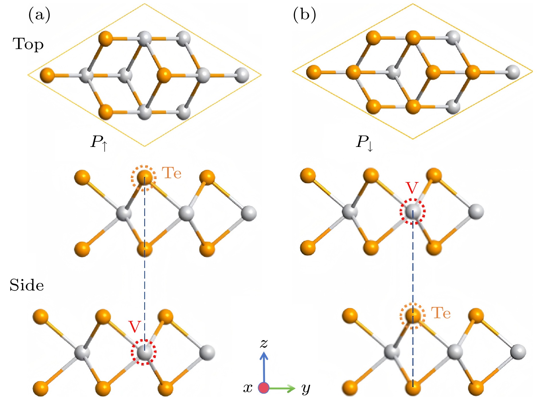 Figure 1. Top and side views of the bilayer VTe2 with two different configurations: (a) P↑; (b) P↓. P↑ and P↓ denote polarization up and polarization down, respectively. Orange and white spheres represent Te and V atoms.