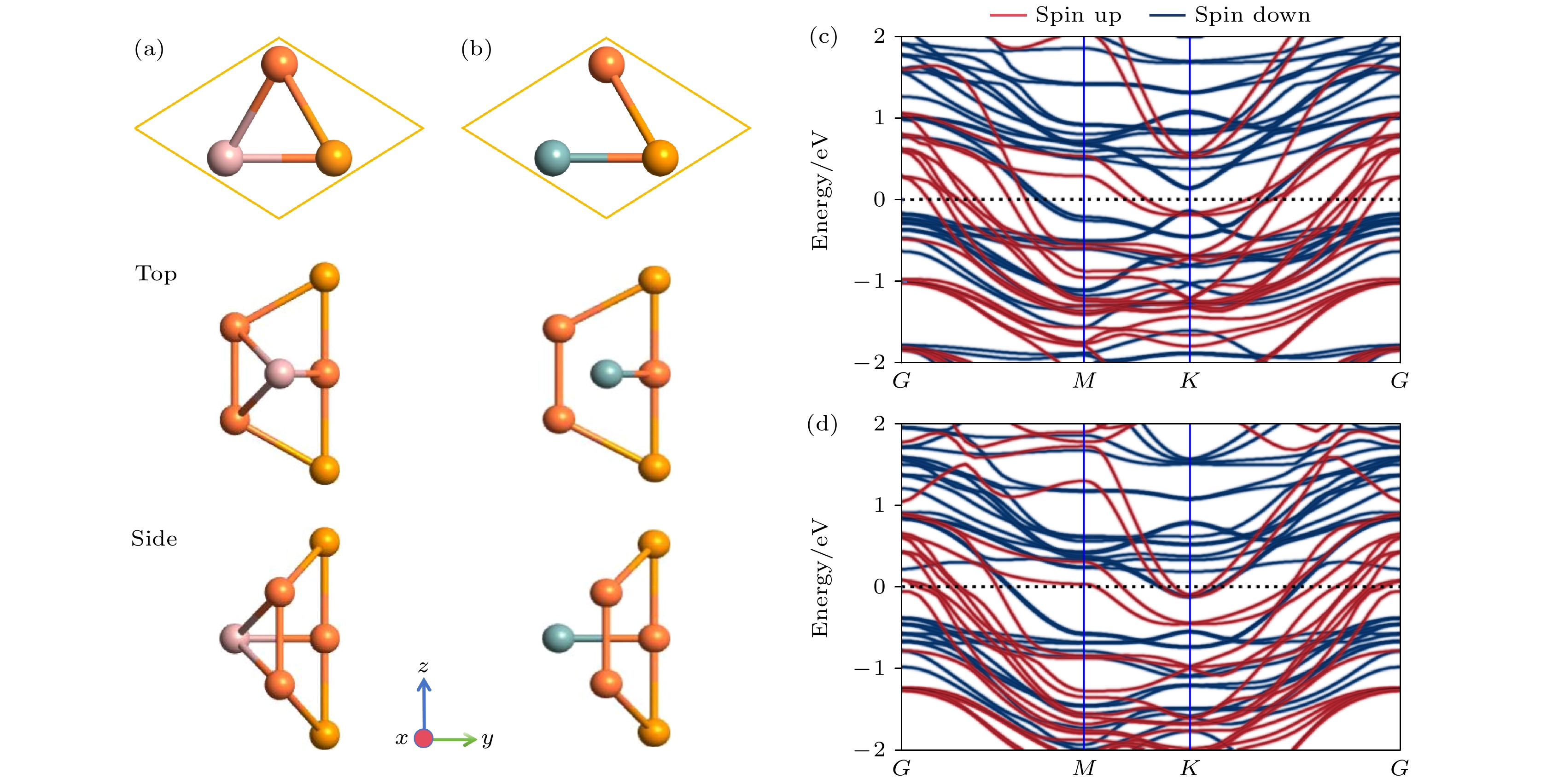 图 3 Fe3GaTe2 (a)和Fe3GeTe2 (b) 的结构示意图. (c), (d)为(a), (b)对应的能带图, 自旋向上(spin up)和自旋向下(spin down)分别用红线和蓝线表示. 图中橙色、粉色、绿色、黄色球体分别代表Fe, Ga, Ge, Te原子