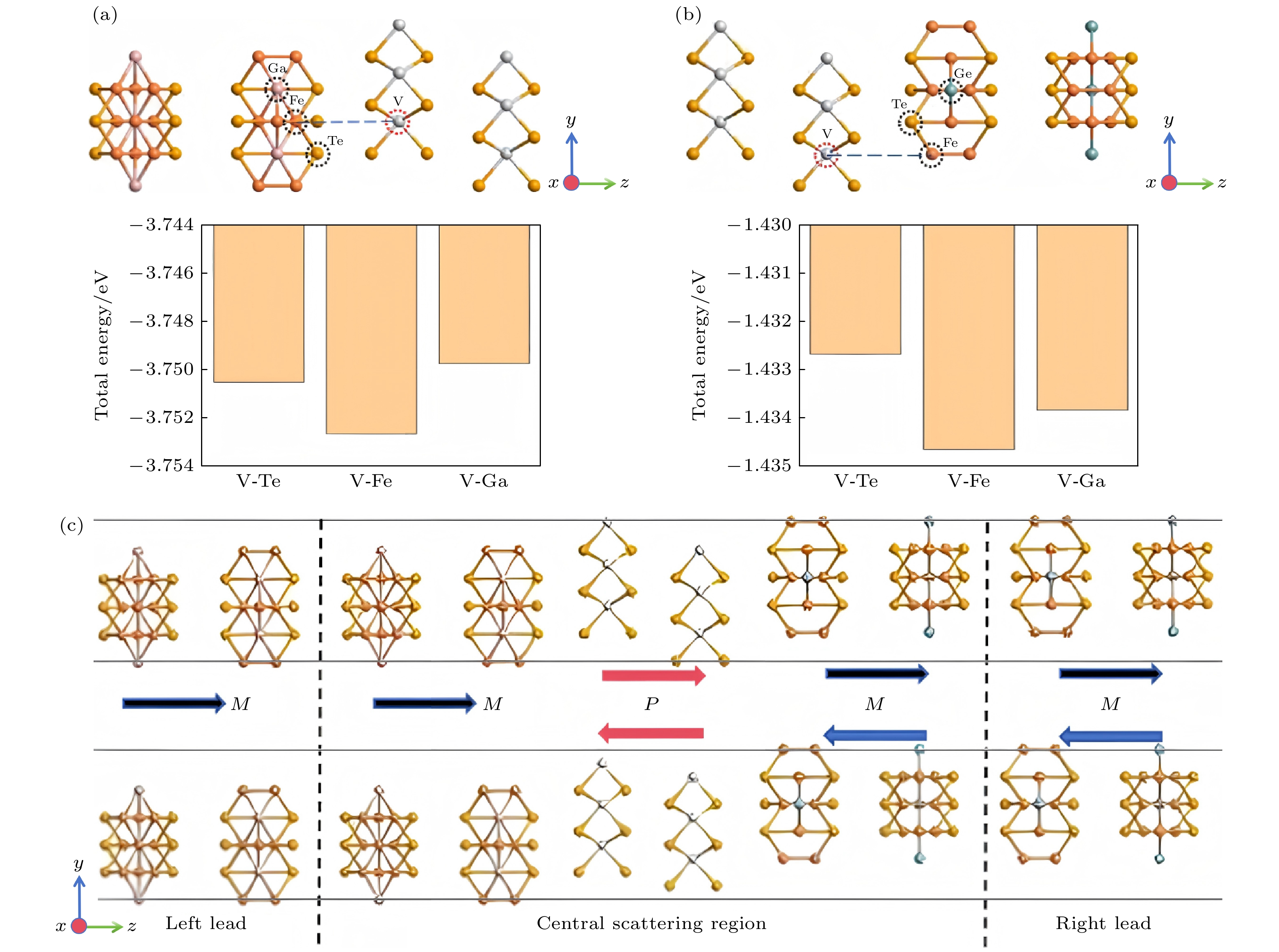 Figure 4. (a), (b) Three high alignments of the intermediate ferroelectric layer (VTe2) and the left and right ferromagnetic layers (Fe3GaTe2, Fe3GeTe2) are considered (left V-Te, V-Fe, and V-Ga; right, V-Te, V-Fe, and V-Ge) and the calculated total energy for the corresponding different alignments. The dotted line represents the atomic alignment, and only one of the three alignments considered is given here as an example. (c) Schematic diagram of the most stable device stacked, the direction of red arrow P denotes polarization of VTe2. Magnetization M is defined as magnetic moment vector, with right (+z) and left (–z) orientations shown by black/blue arrows. Electrodes extend to infinity, device is periodic in xy-plane, and current flows along z-direction.