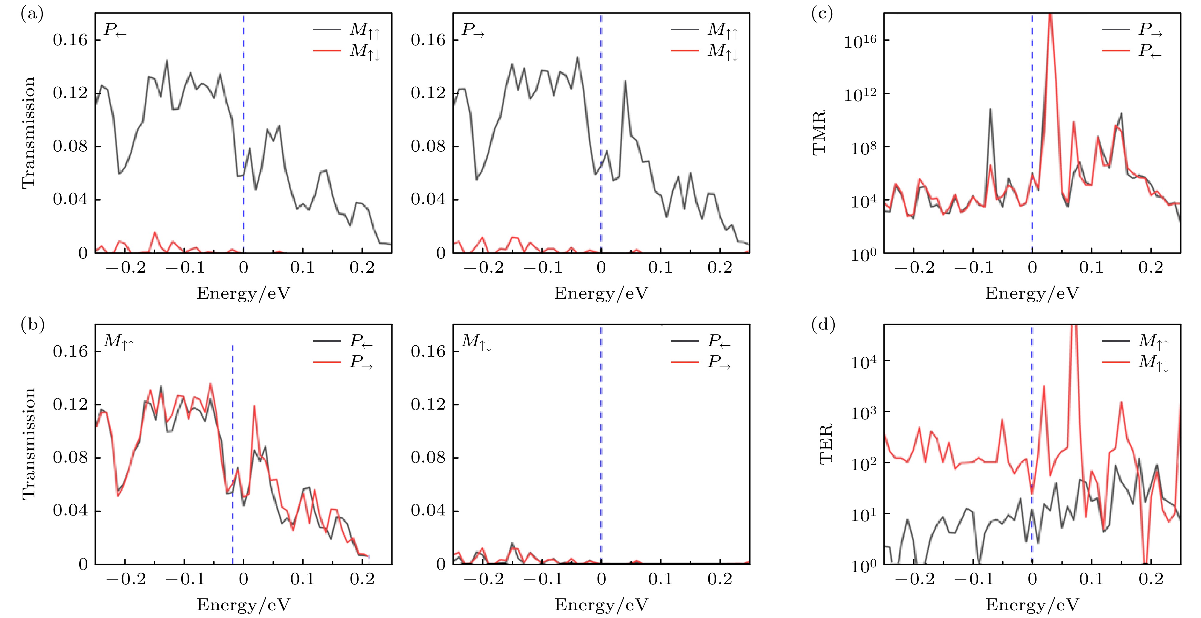 图 7 (a) 处于P←(左)和P→(右)状态的MFTJs的透射谱(自旋向上和自旋向下透射的总和), 黑线和红线分别代表M↑↑和M↑↓态的透射光谱; (b) MFTJs在M↑↑(左)和M↑↓(右)状态下的电子透射谱, 黑线和红线分别代表P→和P←的电子透射光谱; (c) P→和P←状态下MFTJs的TMR, 黑线和红线分别代表P→和P←的TMR; (d) MFTJs在M↑↑和M↑↓状态下的TER, 黑线和红线分别代表M↑↑和M↑↓的TER