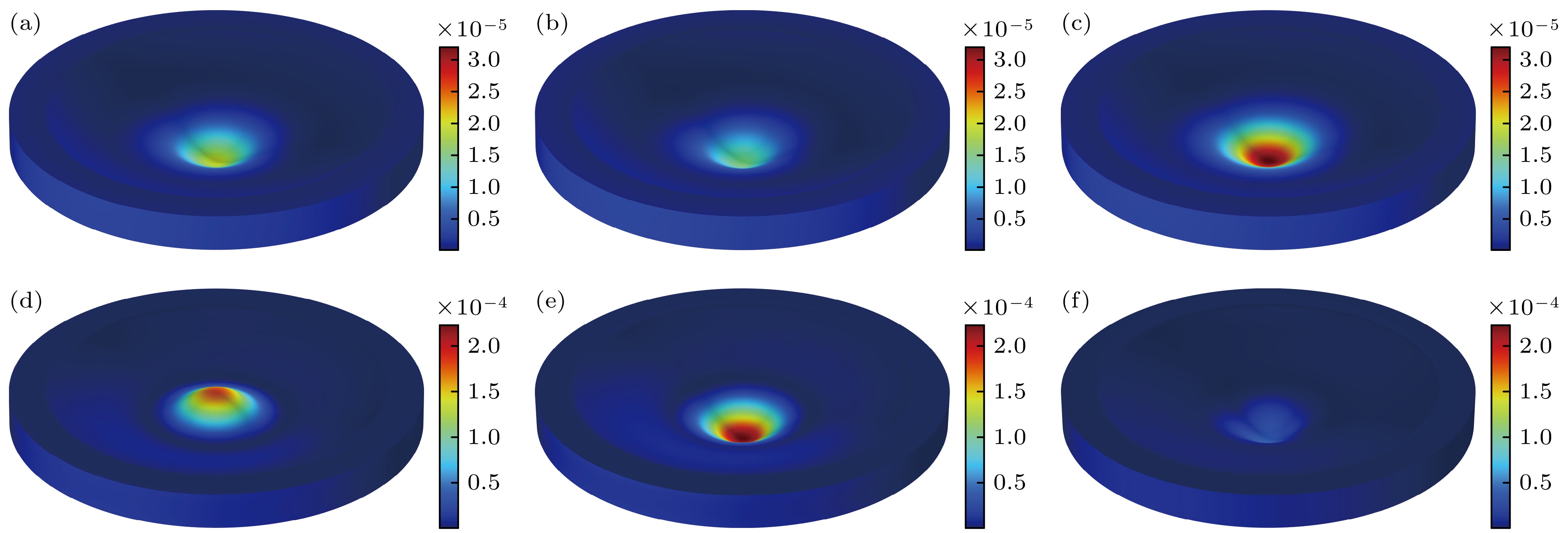 图 13 不同位置不同频率激励信号下的位移响应 (a) 圆周1处施加5.86 kHz信号激励; (b) 圆周2处施加5.86 kHz信号激励; (c) 圆周1和2处共同施加5.86 kHz信号激励; (d) 圆周1处施加6.53 kHz信号激励; (e) 圆周2处施加6.53 kHz信号激励; (f) 圆周1和2处共同施加6.53 kHz信号激励