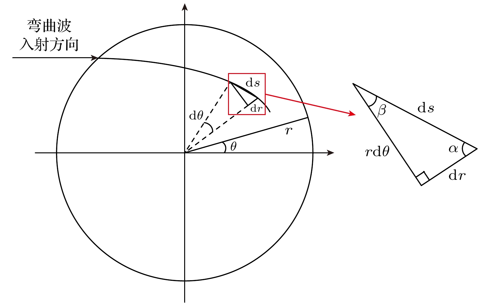 图 12 (a) 面激励等效为无数个同心圆周上线激励叠加; (b) 圆周上线激励近似为无数个线段上线激励叠加