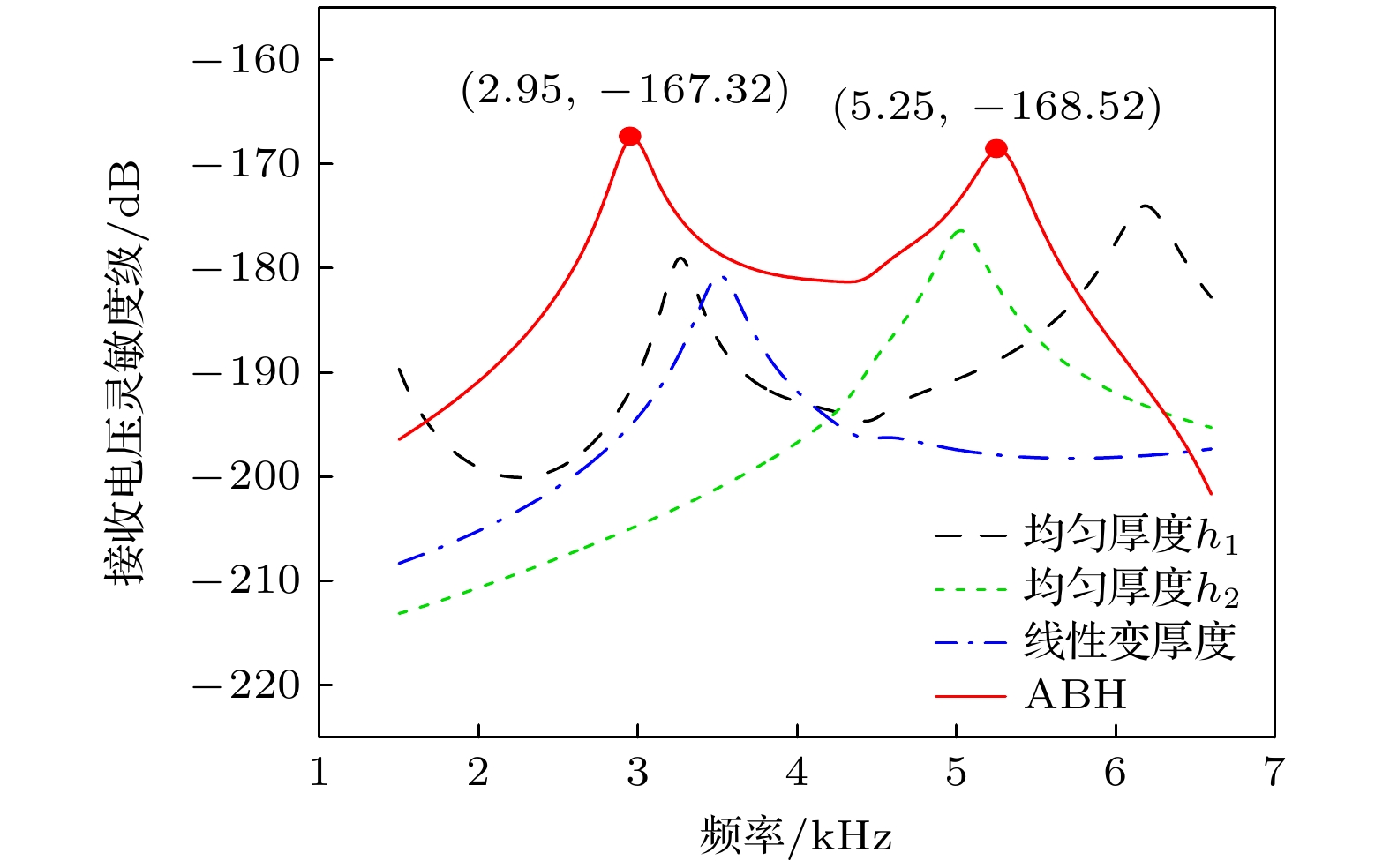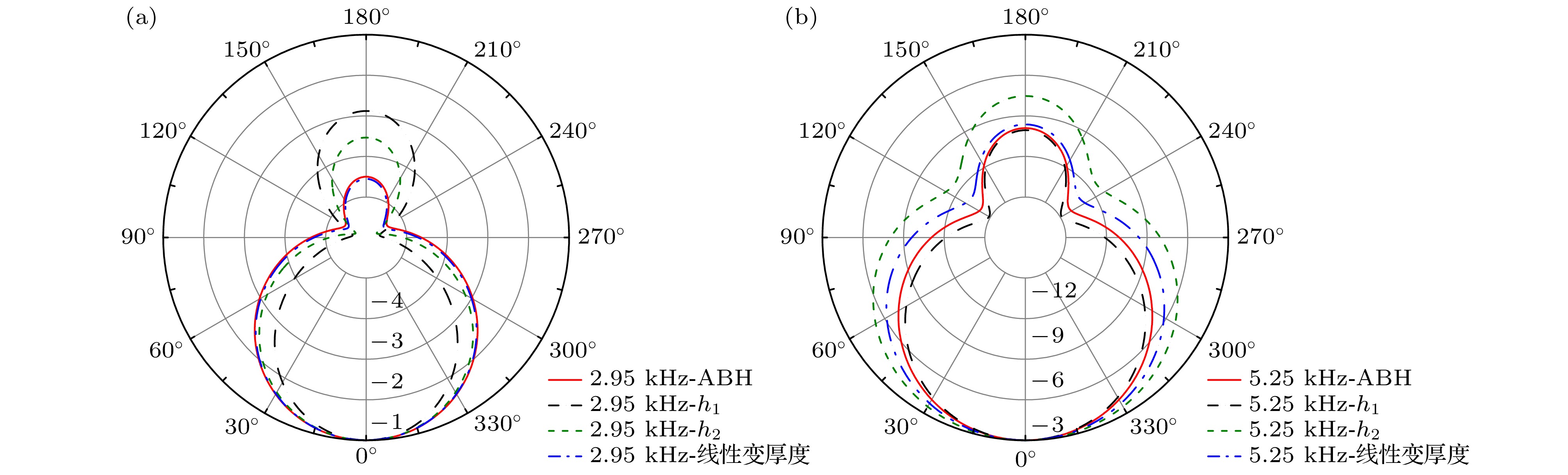 面模型接收灵敏度/dB 指向性–3 dB开角/(°) 最大值 最大起伏 2.95 kHz 5.25 kHz 均匀板$ h = {h_1} $ –178.7 21.35 121.6 91.8 均匀板$ h = {h_2} $ –176.3 33.2 144.8 139.2 线性变厚度板 –180.6 23.1 153.7 116.6 ABH板 –167.3 20.7 156.0 99.0 表 2 ABH水听器的仿真与实测性能对比