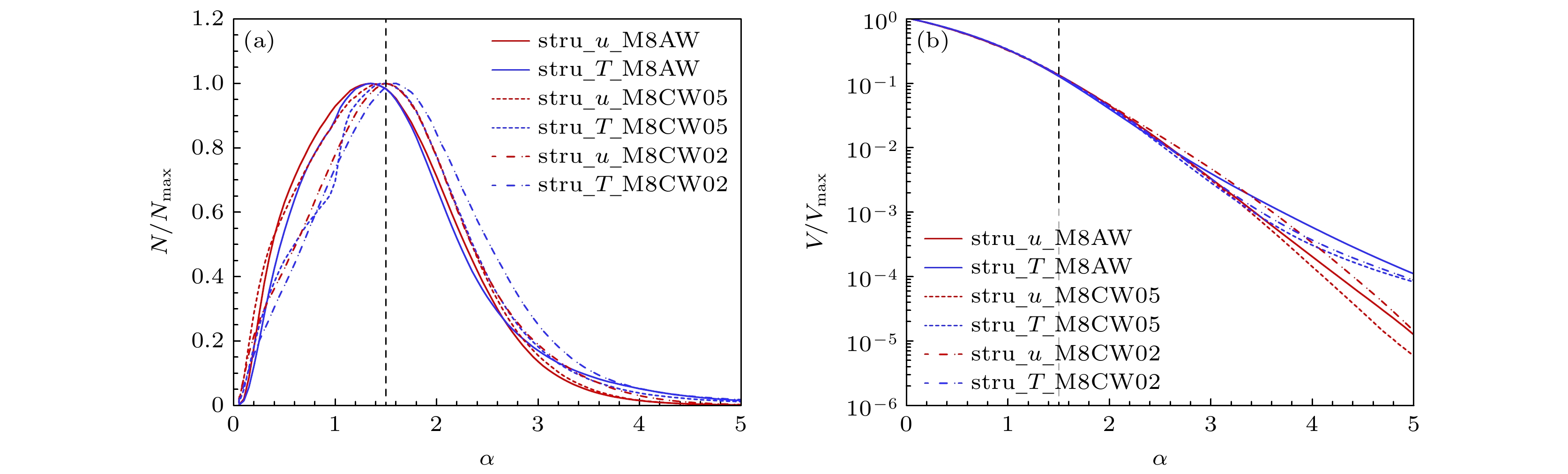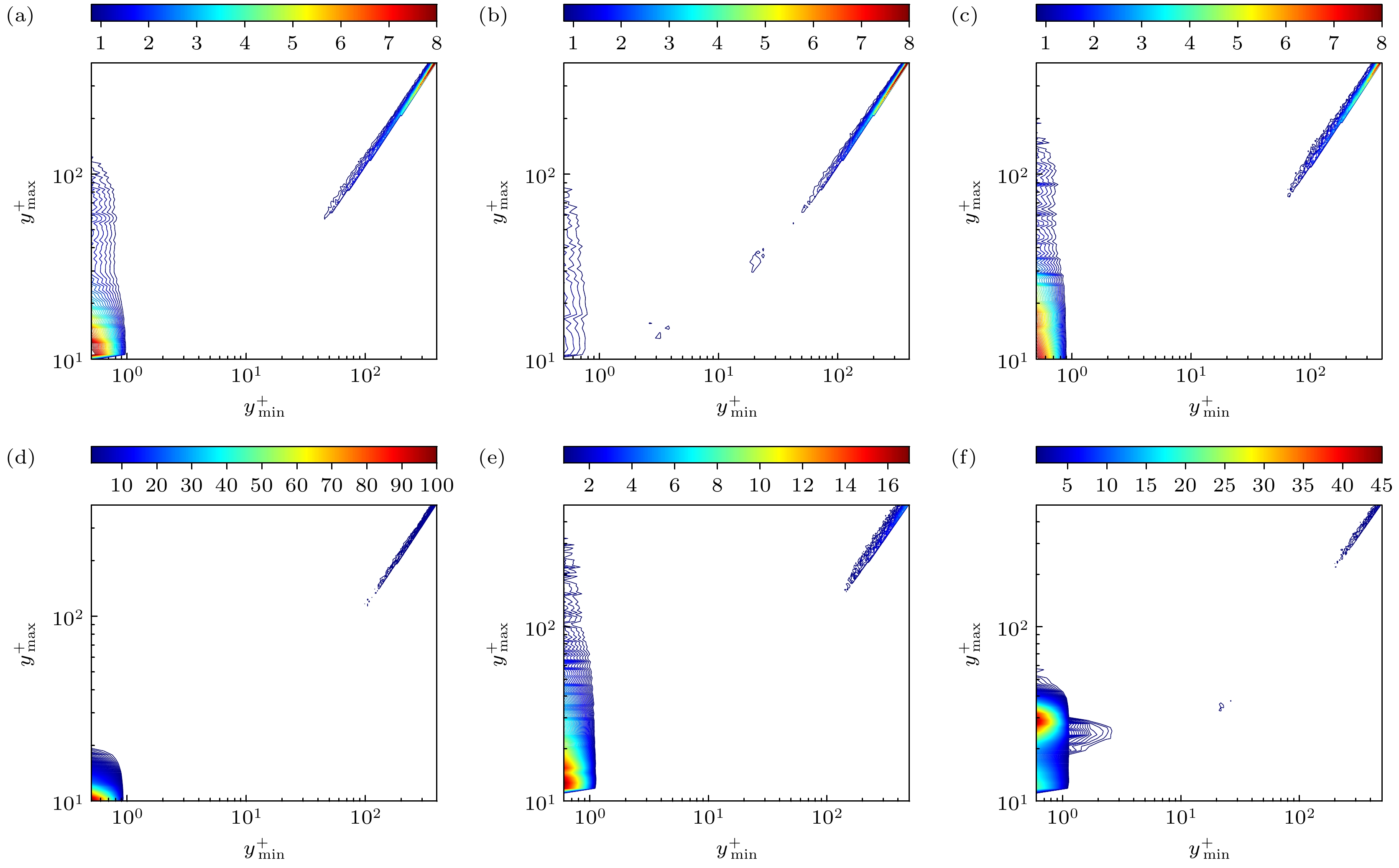 图 6 高速槽道湍流中的结构数量概率分布 M8 AW算例中的(a)速度结构和(b)温度结构; M8 CW02算例中的(c)速度结构和(d)温度结构; M8 CW05算例中的(e)速度结构和(f)温度结构