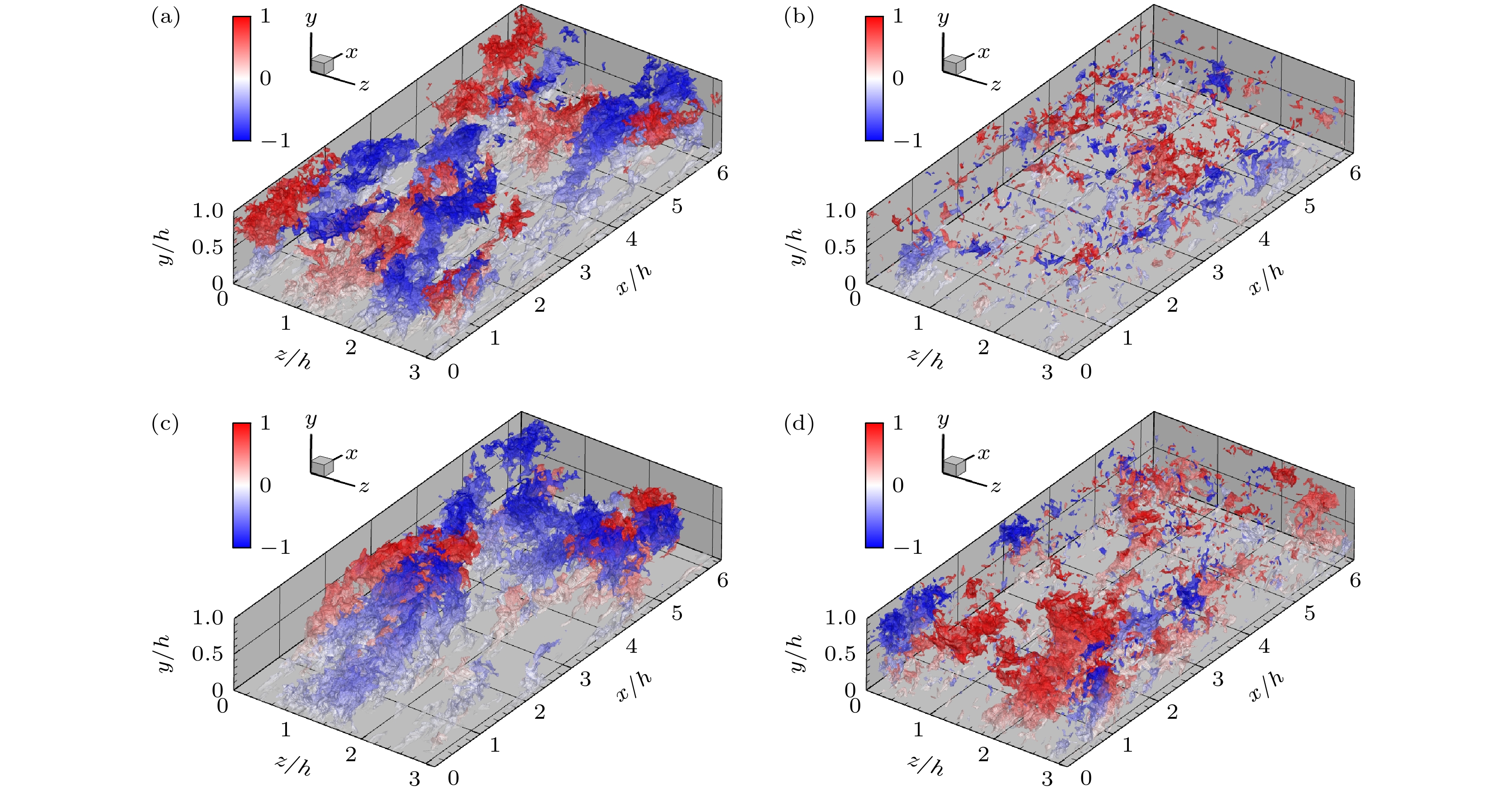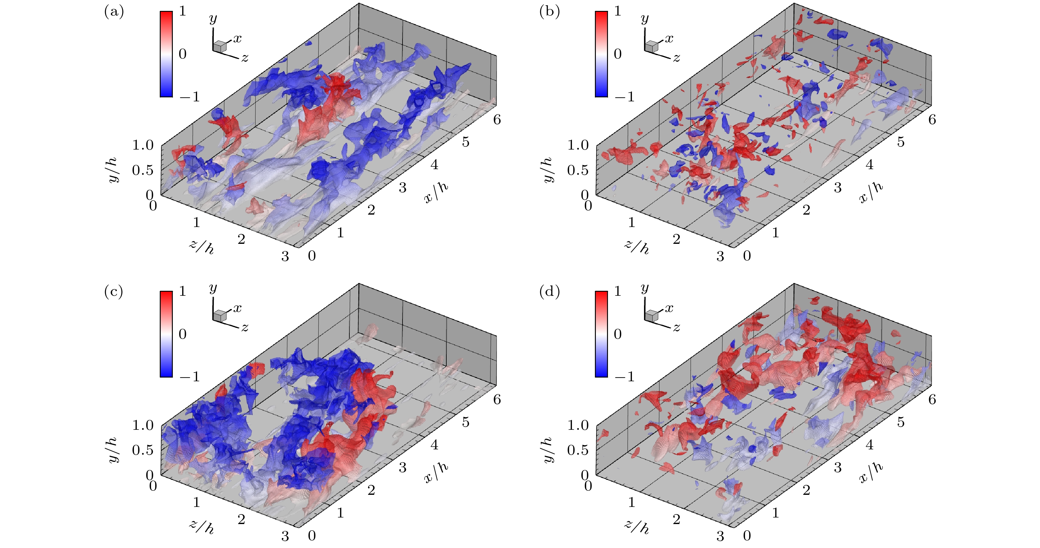 Figure 3. (a) Velocity wall-attached structures, (b) velocity wall-detached structures, (c) temperature wall-attached structures, and (d) temperature wall-detached structures in the M8 AW case of high-speed turbulent channel flow.