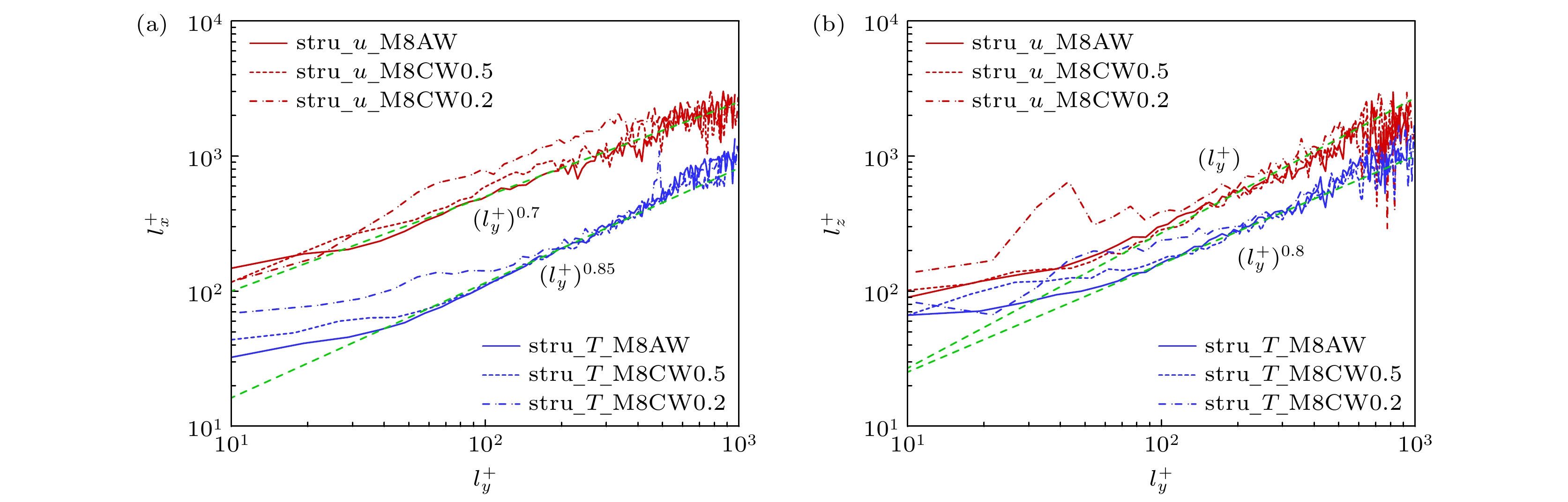 算例 ${{{T_{\text{w}}}} \mathord{\left/ {\vphantom {{{T_{\text{w}}}} {{T_{\text{r}}}}}} \right. } {{T_{\text{r}}}}}$ $R{e_\tau }$ ${M_{\text{b}}}$ ${M_{\text{c}}}$ $\Delta {x^ + }$ $\Delta y_{\text{w}}^ + $ $\Delta {z^ + }$ M8 AW 1.0 504 4.44 6.93 5.5 0.50 2.7 M8 CW05 0.5 450 4.61 6.15 4.8 0.46 2.4 M8 CW02 0.2 540 4.79 6.03 9.9 0.59 2.9 表 2 不同速度结构下湍动能生成项对壁面摩阻的贡献占比$ {{{C_{{\text{f, T}}}}} \mathord{\left/ {\vphantom {{{C_{{\text{f, T}}}}} {{C_{\text{f}}}}}} \right. } {{C_{\text{f}}}}} $