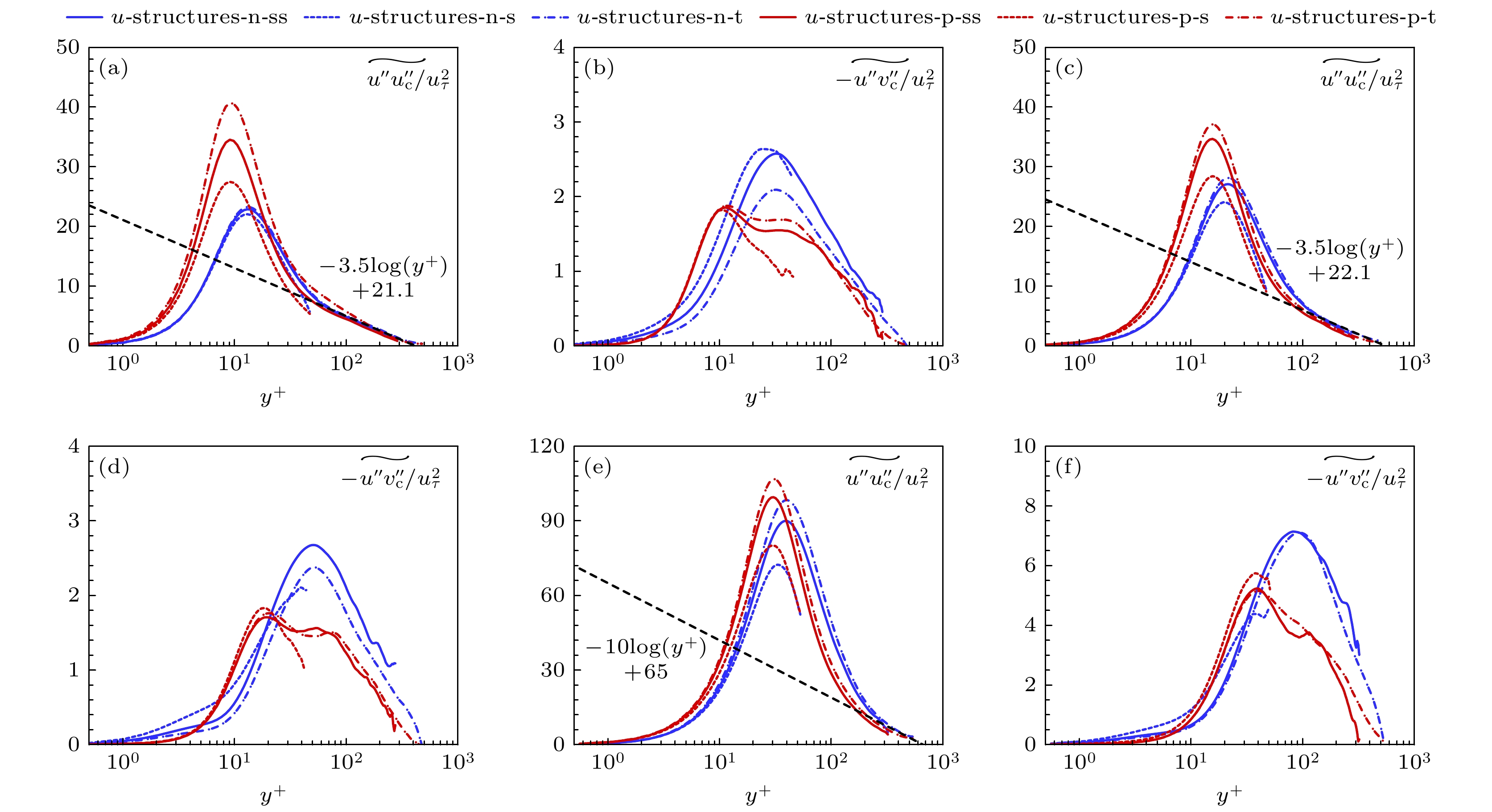 Figure 8. Conditional averaging results of velocity wall-attached structures in high-speed turbulent channel flow: (a) Streamwise Reynolds normal stress and (b) shear Reynolds stress in the M8 AW case; (c) streamwise Reynolds normal stress and (d) shear Reynolds stress in the M8 CW05 case; (e) streamwise Reynolds normal stress and (f) shear Reynolds stress in the M8 CW02 case. Here, p and n denote high-speed and low-speed structures, respectively; ss, s, and t represent self-similar, squat, and tall structures, respectively.