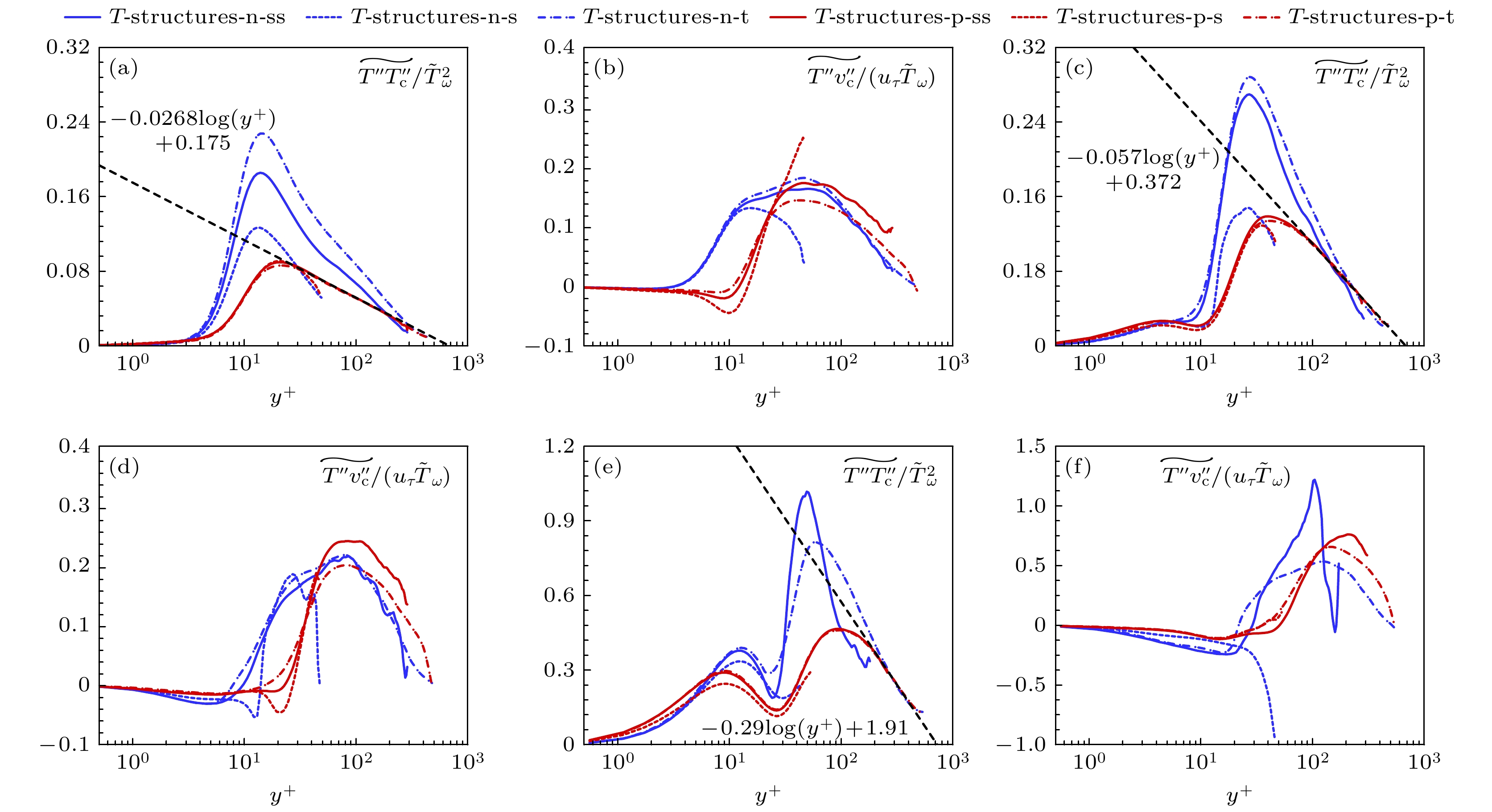 Figure 9. Conditional averaging results of temperature wall-attached structures in high-speed turbulent channel flow: (a) Mean square of temperature fluctuations and (b) turbulent heat flux in the M8 AW case; (c) mean square of temperature fluctuations and (d) turbulent heat flux in the M8 CW05 case; (e) mean square of temperature fluctuations and (f) turbulent heat flux in the M8 CW02 case. Here, p and n denote high-temperature and low-temperature structures, respectively; ss, s, and t represent self-similar, squat, and tall structures, respectively.