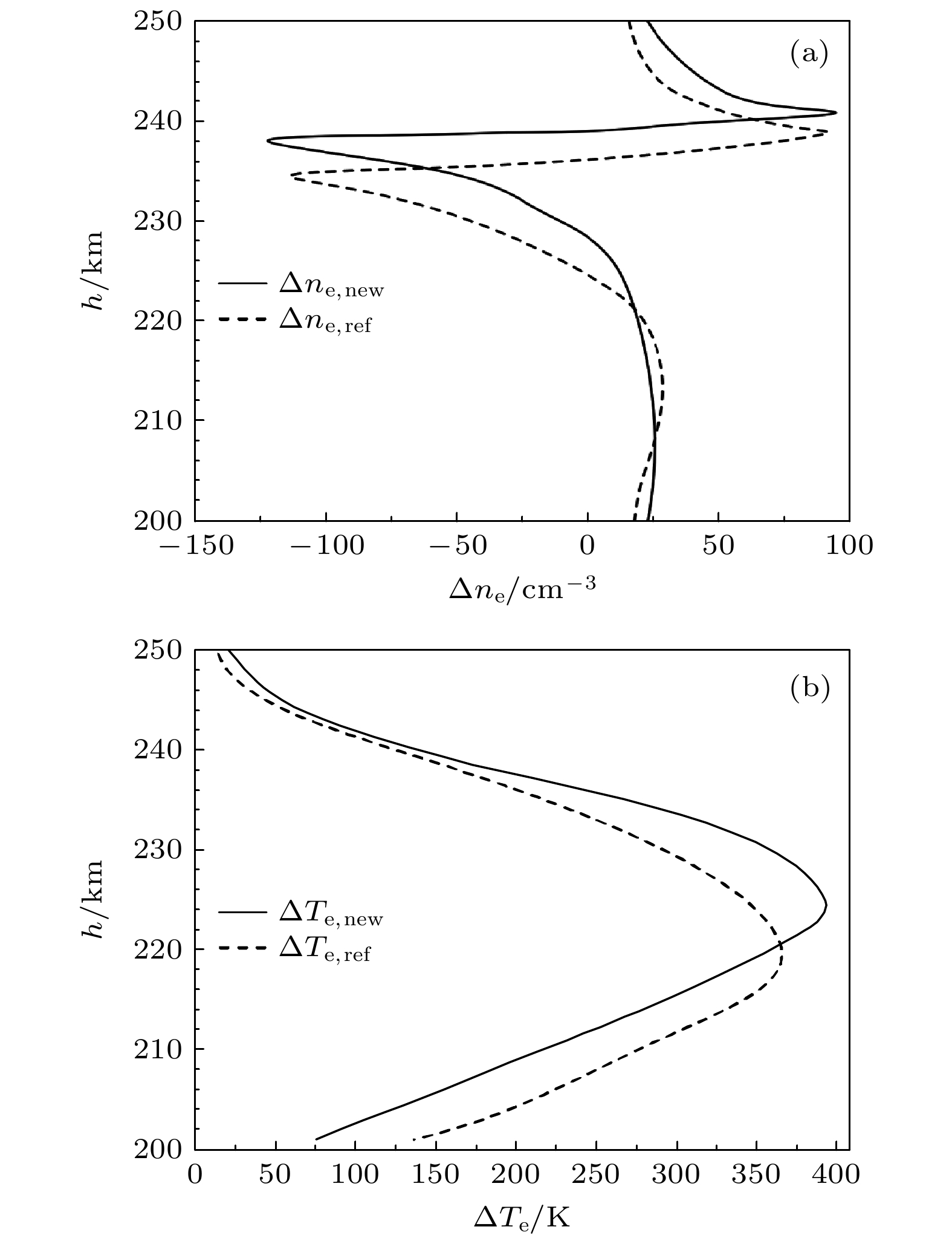 粒子种类 碰撞截面/cm2 N2 $(2.82-3.41\times 10^{-4} T_{\rm e}) \times T_{\rm e}^{1/2} \times 10^{-17} $ O2 $2.2\times 10^{-16} \times (1+3.6\times 10^{-2}T_{\rm e}^{1/2})$ O $1\times 10^{-15} $ H $(54.7-7.45\times 10^{-3}T_{\rm e}) \times 10^{-16} $ He $5.6\times 10^{-16} $ 粒子种类 碰撞频率/Hz N2 $2.33\times 10^{-11} n({\rm N_2}) (1-1.2\times 10^{-4} T_{\rm e}) T_{\rm e} $ O2 $1.8\times 10^{-10} n({\rm O_2}) (1 + 3.6\times 10^{-2}T_{\rm e}^{1/2}) T_{\rm e}^{1/2} $ O $8.2\times 10^{-10} n({\rm O} ) T_{\rm e}^{1/2} $ H $4.5\times 10^{-9}n({\rm H}) \times (1-1.35\times 10^{-4} T_{\rm e}) T_{\rm e}^{1/2} $ He $4.6\times 10^{-10}n({\rm He})T_{\rm e}^{1/2} $ 表 3 电磁波对电离层等离子体加热背景参数[31]