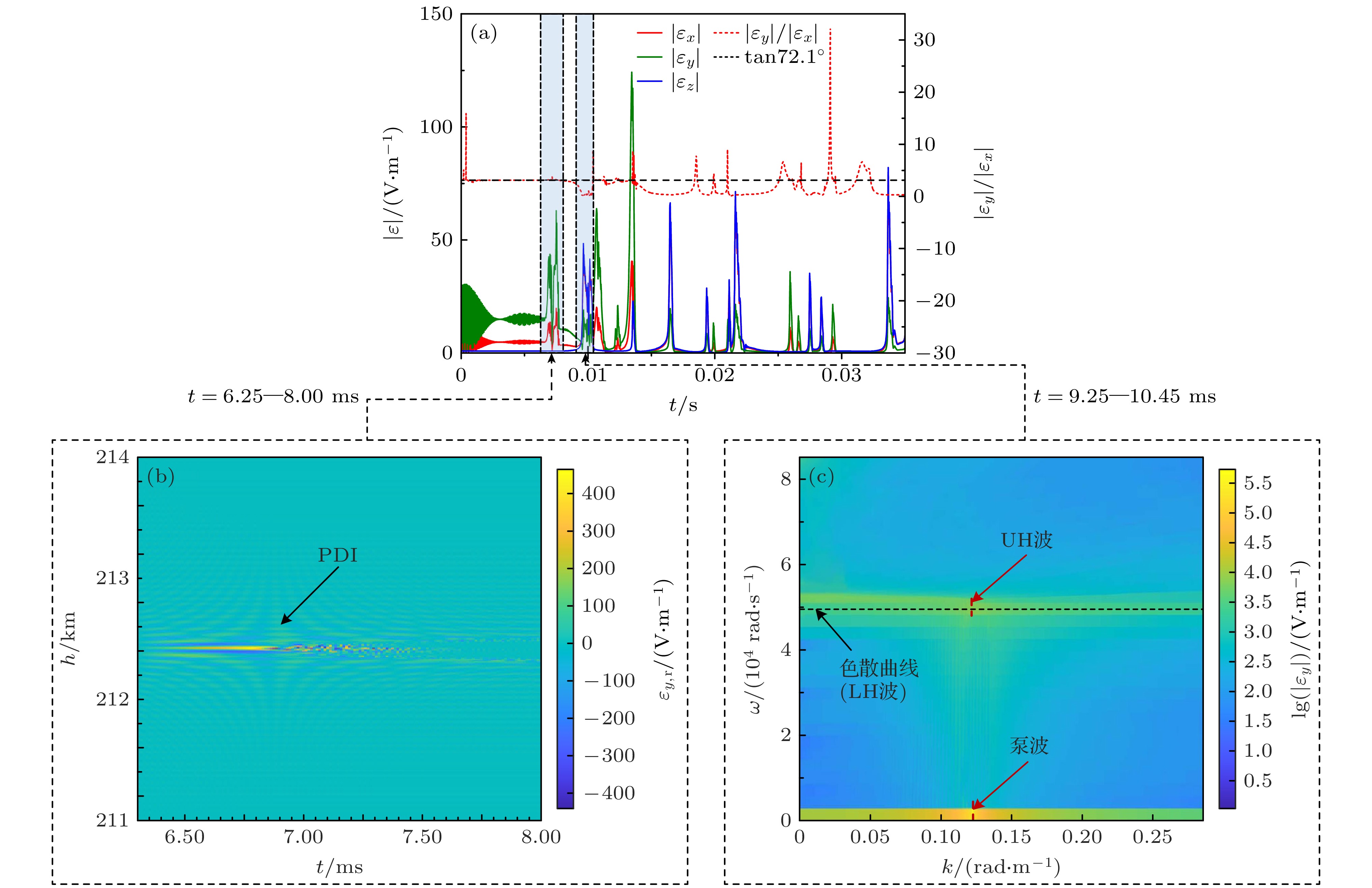 Figure 6. Evolutions of plasma parametric instabilities: (a) Temporal evolutions of the electric field intensity in the x, y and z directions at a height of h = 212 km; (b) two-dimensional contour of the spatiotemporal evolution of the real part of the slow-varying amplitude of the electric field in the y direction (εy, r) during t = 6.25—8.00 ms; (c) two-dimensional Fourier transform of the electric field intensity in the y direction during t = 9.25—10.45 ms.