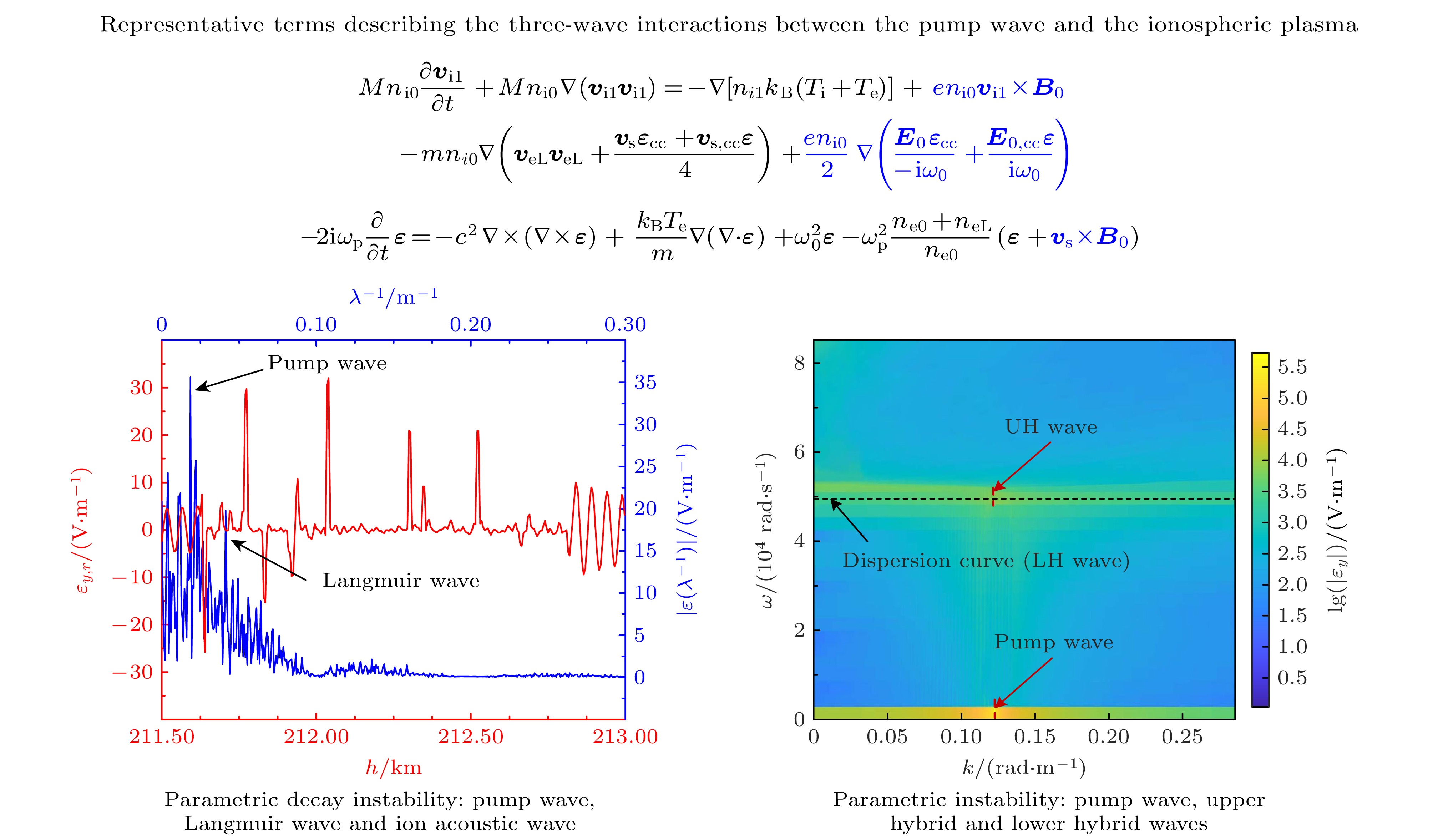 In low-pressure plasmas, the collisions between particles are weak and insufficient damping from collisions, leading to the gradual development of various waves and instabilities. Thus, the effects of wave-particle interaction are non-negligible in the non-equilibrium transport processes in plasma under low pressure conditions. For example, the heating of ionospheric plasma by high-frequency electromagnetic waves plays an important role in achieving over-the-horizon communication. During the wave propagation through the ionosphere, the electromagnetic radiation changes the local electron temperature and density, and simultaneously, excites various wave modes and instabilities. This study focuses on the interactions between high-power electromagnetic waves emitted from the ground and ionospheric plasma. Based on the plasma fluid model and Zakharov method, a physical-mathematical model is established to describe the wave-wave and wave-particle interactions in the ionospheric plasmas under the excitation of the pump waves. The modeling results of the active heating of ionosphere show that when the ground-emitted waves propagate in the ionospheric plasma, the energy deposition of the electromagnetic waves at the reflection height will excite a strong localized electric field, leading to the parametric instabilities. When the frequency and wave vector matching conditions are satisfied, two different three-wave interactions will be excited, i.e. the parametric decay instability involving the pump wave, Langmuir wave and ion acoustic wave, as well as the parametric instability related to the pump wave, upper hybrid and lower hybrid waves. Within a certain range of pump frequency and power studied in this study, the decrease of the pump frequency will lead to the decrease of the reflection height of the ordinary waves, and simultaneously, the perturbation ratios of the electron temperature will also increase. A higher pump wave power will enhance the energy absorption of the ionospheric plasma by the pump wave, thereby increasing the electron temperature. The modeling results not only reveal the spatiotemporal evolutions of the ionospheric plasma characteristics under various pump parameters and the energy transport processes between waves and particles, but also theoretically explain the parametric instability, stimulated electromagnetic emission and other phenomena observed in experiments.