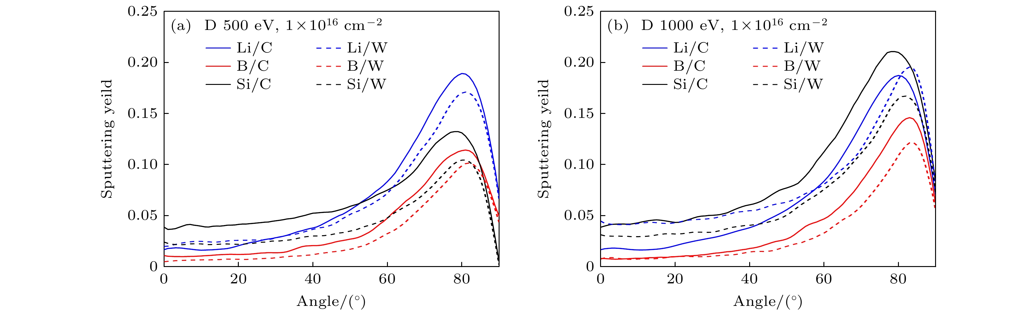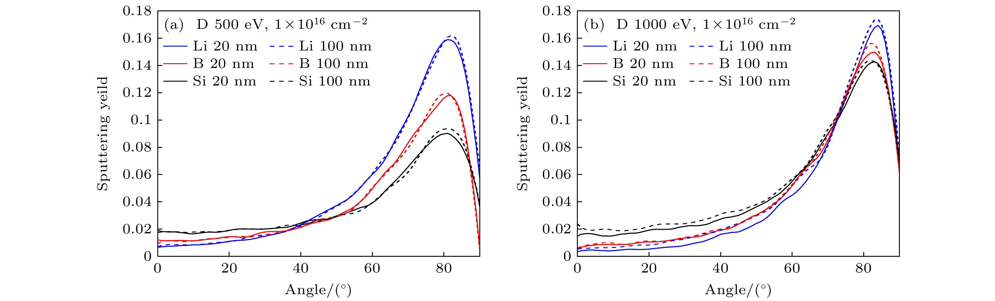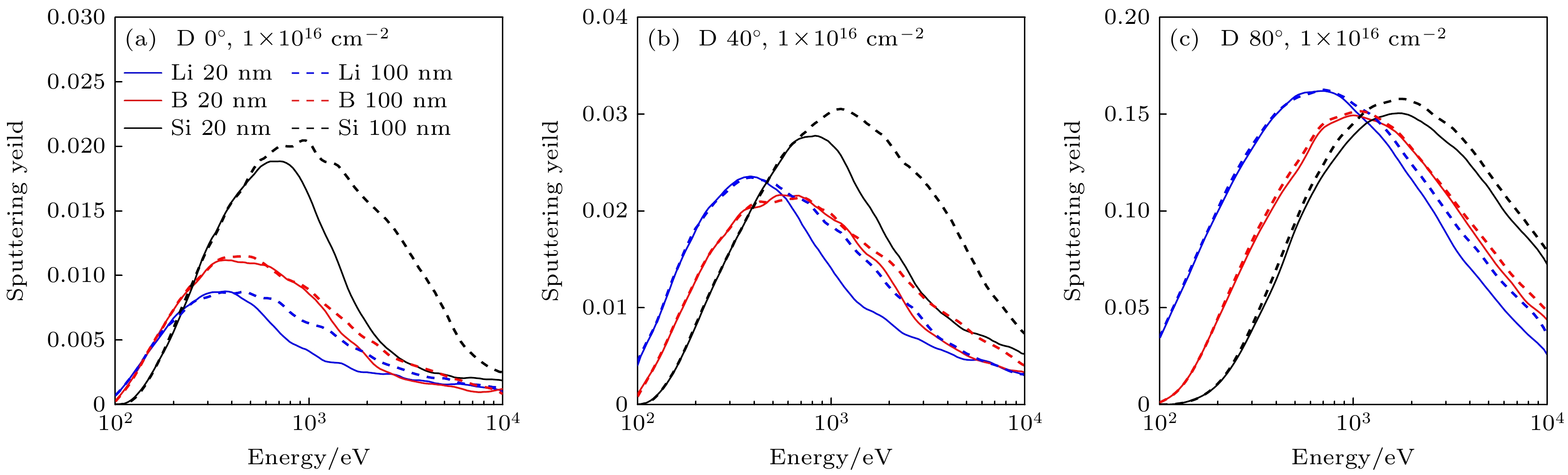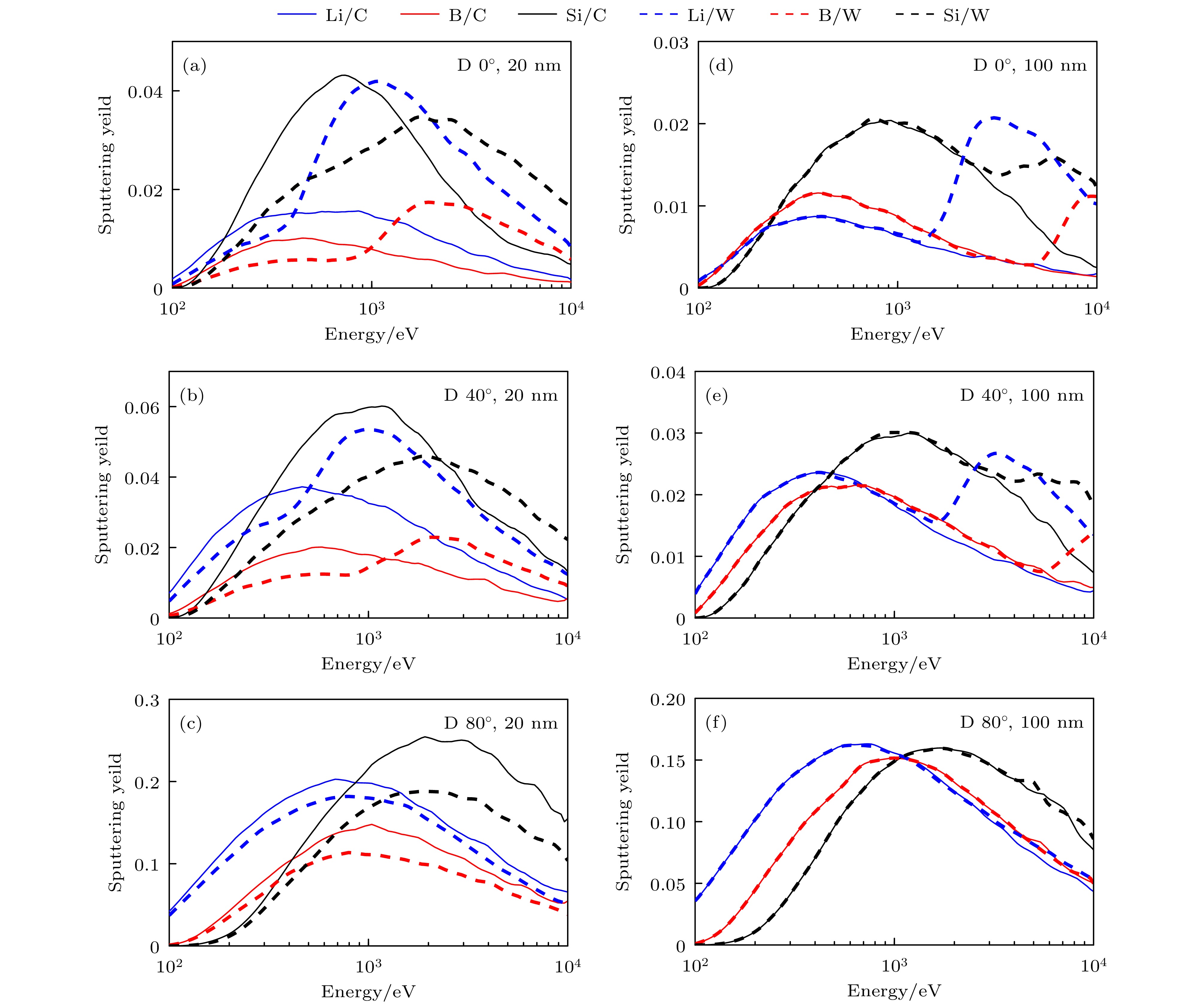 图 5 溅射产额随入射能量的变化曲线 (a)氘粒子入射角度0°, 涂层厚度20 nm; (b)氘粒子入射角度40°, 涂层厚度20 nm; (c)氘粒子入射角度80°, 涂层厚度20 nm; (d)氘粒子入射角度0°, 涂层厚度100 nm; (e)氘粒子入射角度40°, 涂层厚度100 nm; (f)氘粒子入射角度80°, 涂层厚度100 nm