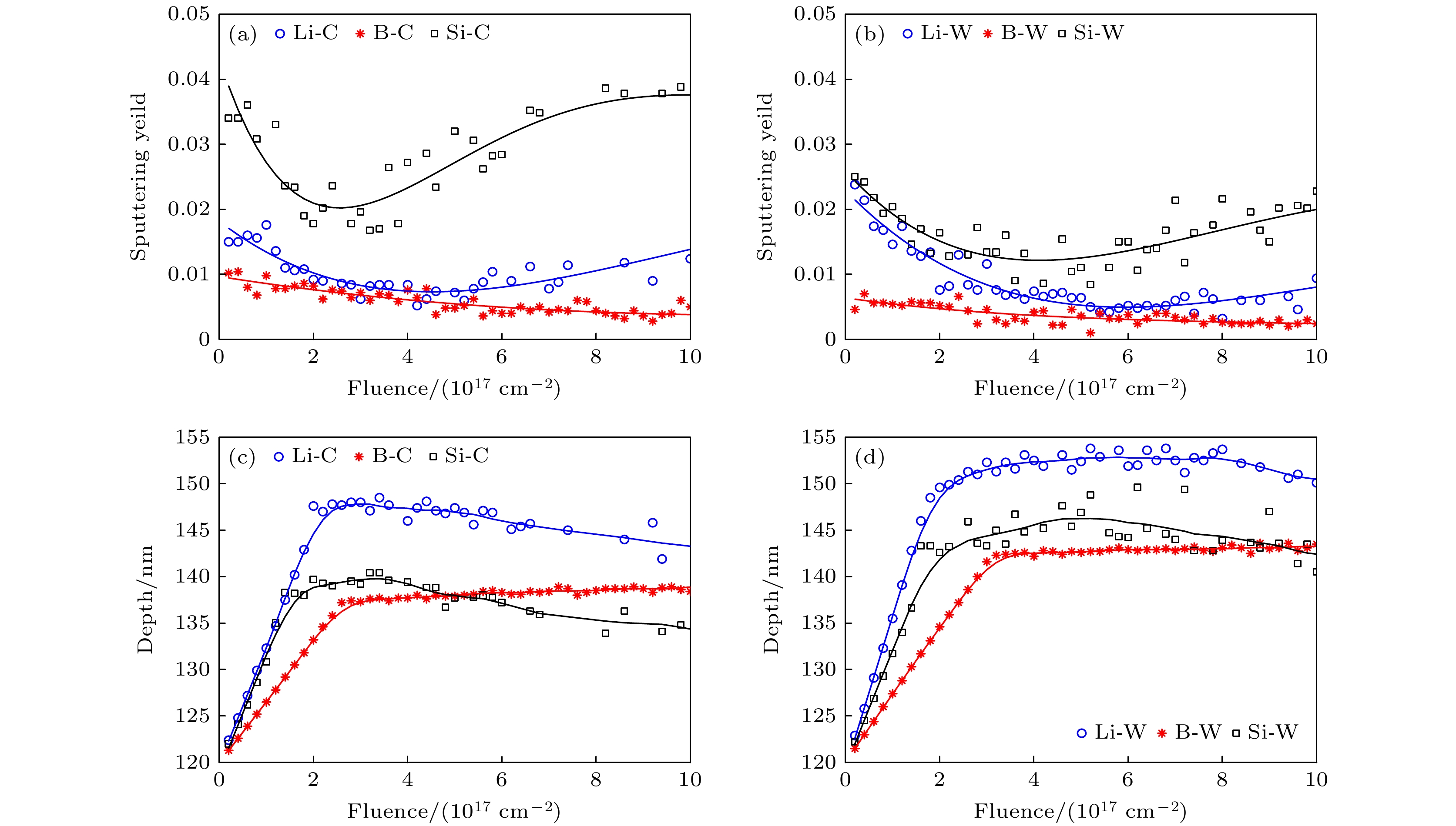 Figure 6. Dependence of sputtering yield and target thickness on injection fluence: (a) Sputtering yield of carbon substrates; (b) sputtering yield of tungsten substrates; (c) thickness of carbon substrates; (d) thickness of tungsten substrates.