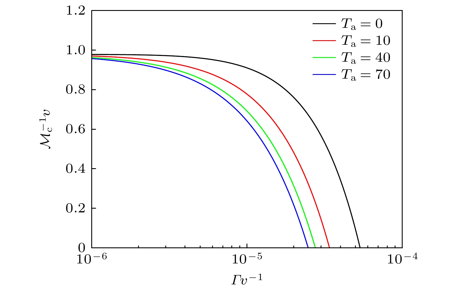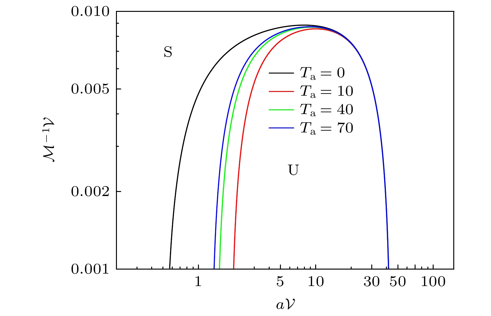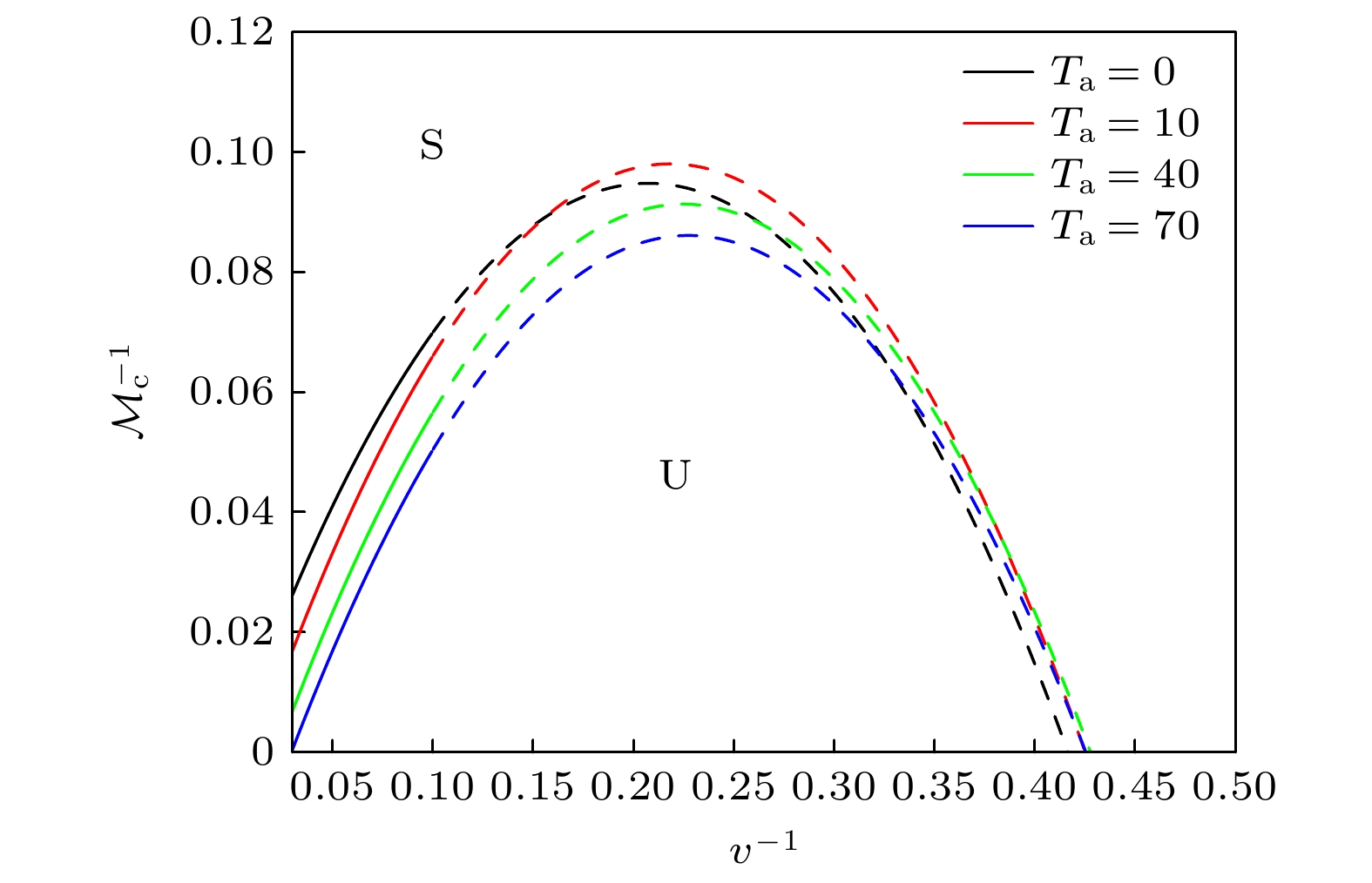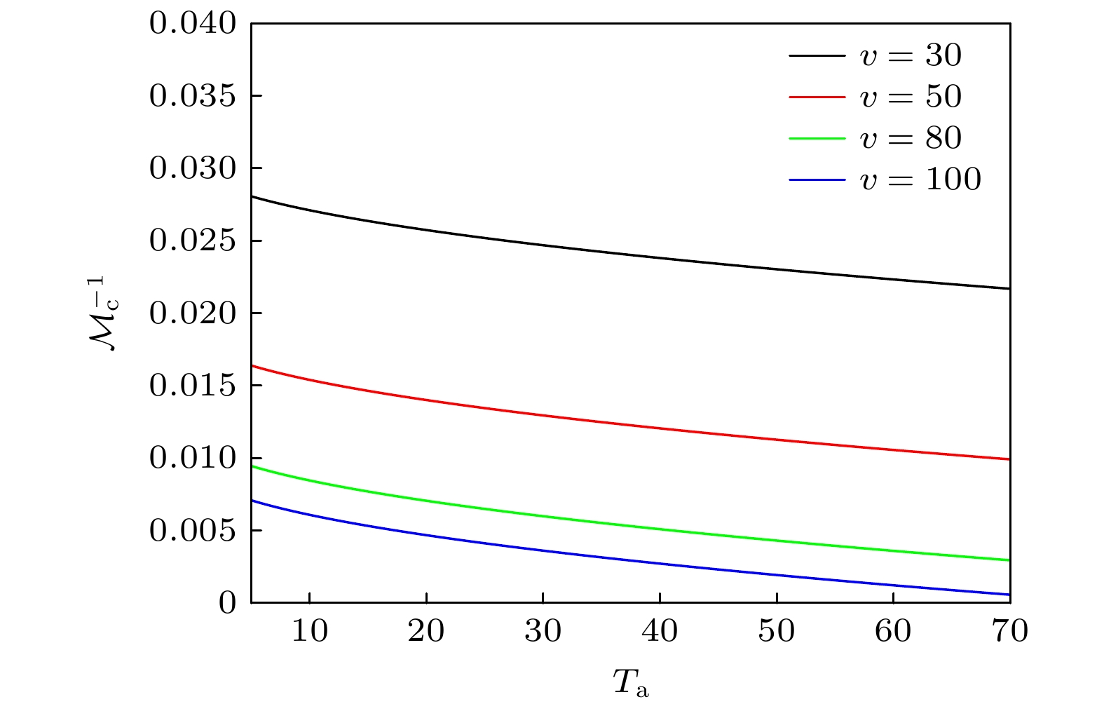 图 3 不同泰勒数$ {T_{\mathrm{a}}} $下, 逆临界形态数$ {\cal{M}}_{\mathrm{c}}^{ - 1} $随$ {v^{ - 1}} $变化的函数关系, 所用参数取值为$ \beta = 1 $, $ {k_{\mathrm{E}}} = 0.5 $, $ {\cal{R}} = 1 $, $ \varGamma $ = 0.06