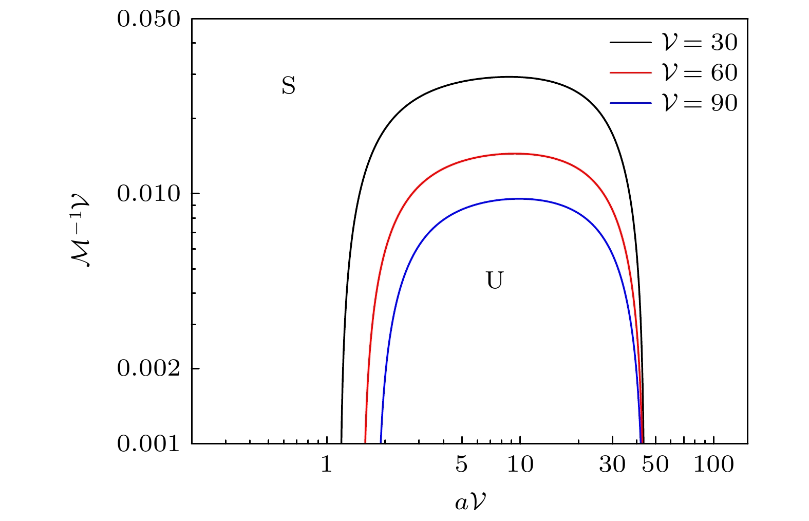 图 5 平面$ (\alpha {\cal{V}}, {{\cal{M}}^{ - 1}}{\cal{V}}) $上的中性稳定性曲线, 所用参数取值为$ {a_2} = 0 $, $ \beta/v = 0.01 $, $ {k_{\mathrm{E}}} = 0.5 $, $ {\cal{R}}$ = 1