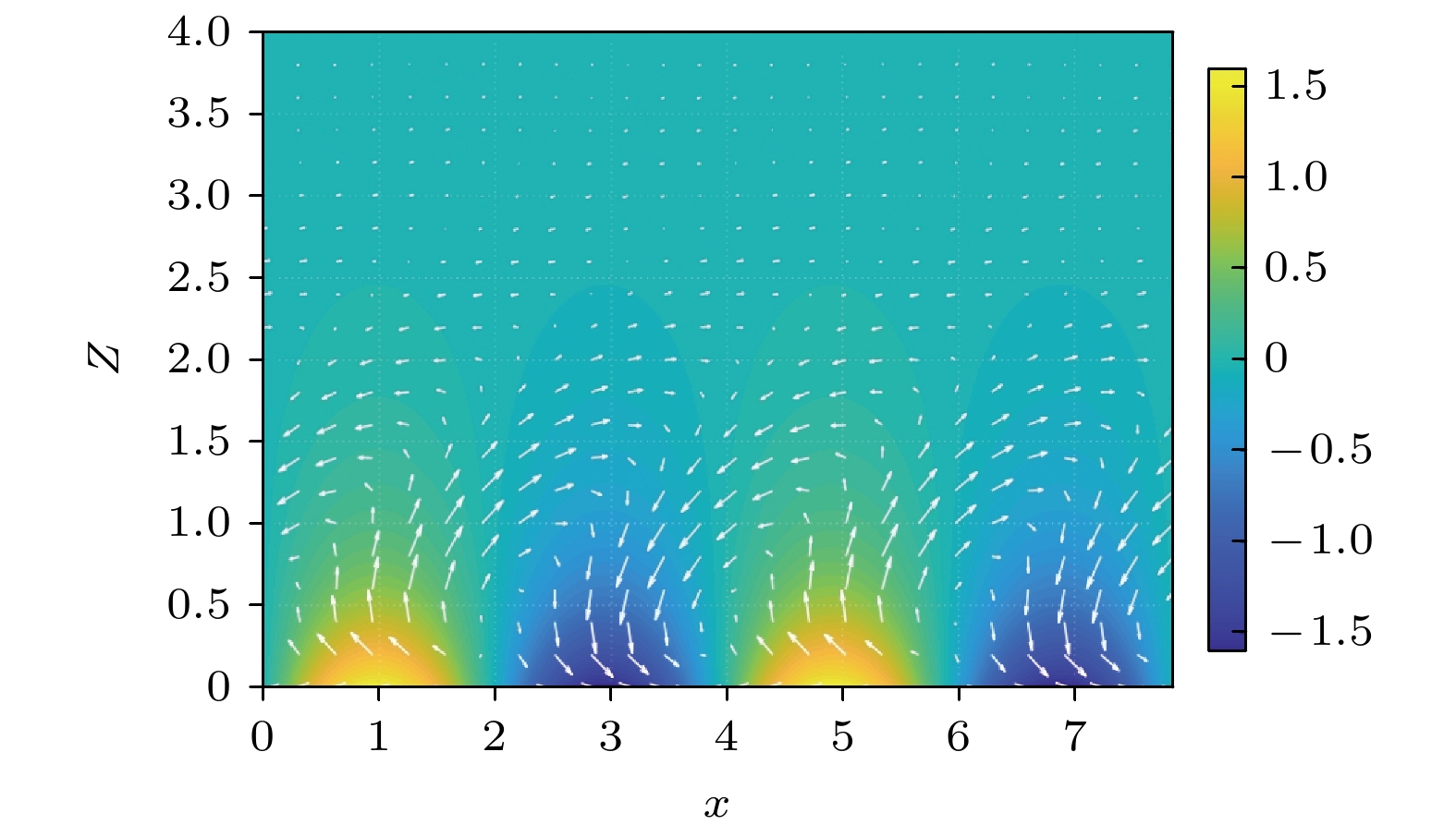 图 7 当泰勒数$ {T_{\mathrm{a}}} = 10 $时, 熔池内瞬时扰动浓度场与速度场分布图, 所用参数取值为$ {a_1} = 1.6 $, $ {a_2} = 0 $, $ {\cal{R}}$ = 1. 图中彩色背景表示扰动浓度场, 白色箭头表示扰动速度矢量场