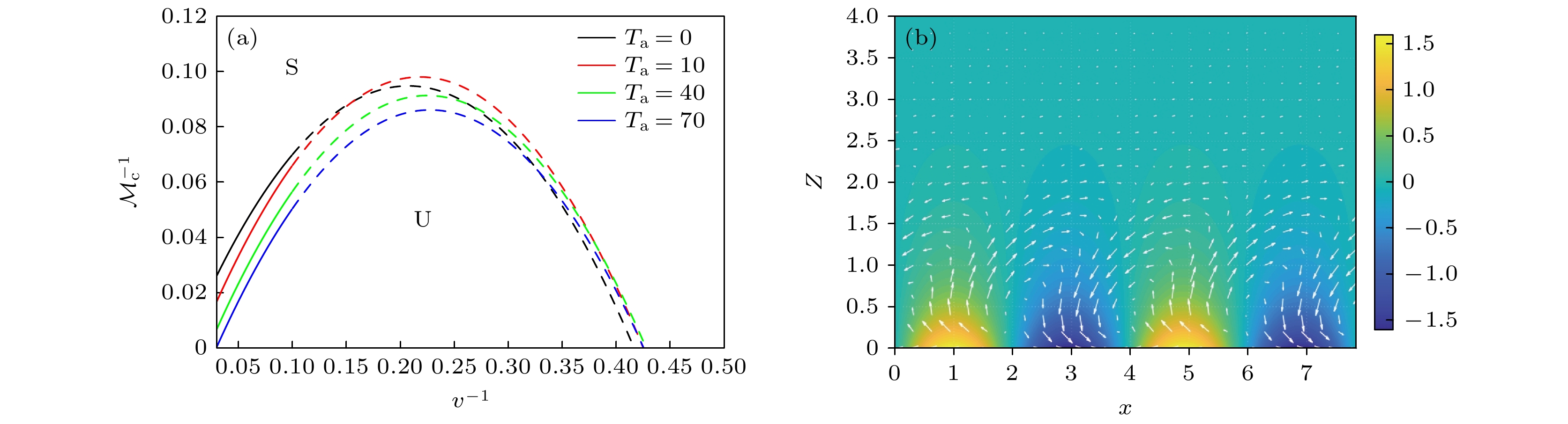 图 2 不同流速下, 逆临界形态数$ {\cal{M}}_{\mathrm{c}}^{ - 1} $随泰勒数$ {T_{\mathrm{a}}} $的变化曲线, 所用参数取值为$ \beta = 1 $, $ {k_{\mathrm{E}}} = 0.5 $, $ {\cal{R}} = 1 $, $ \varGamma $ = 0.02
