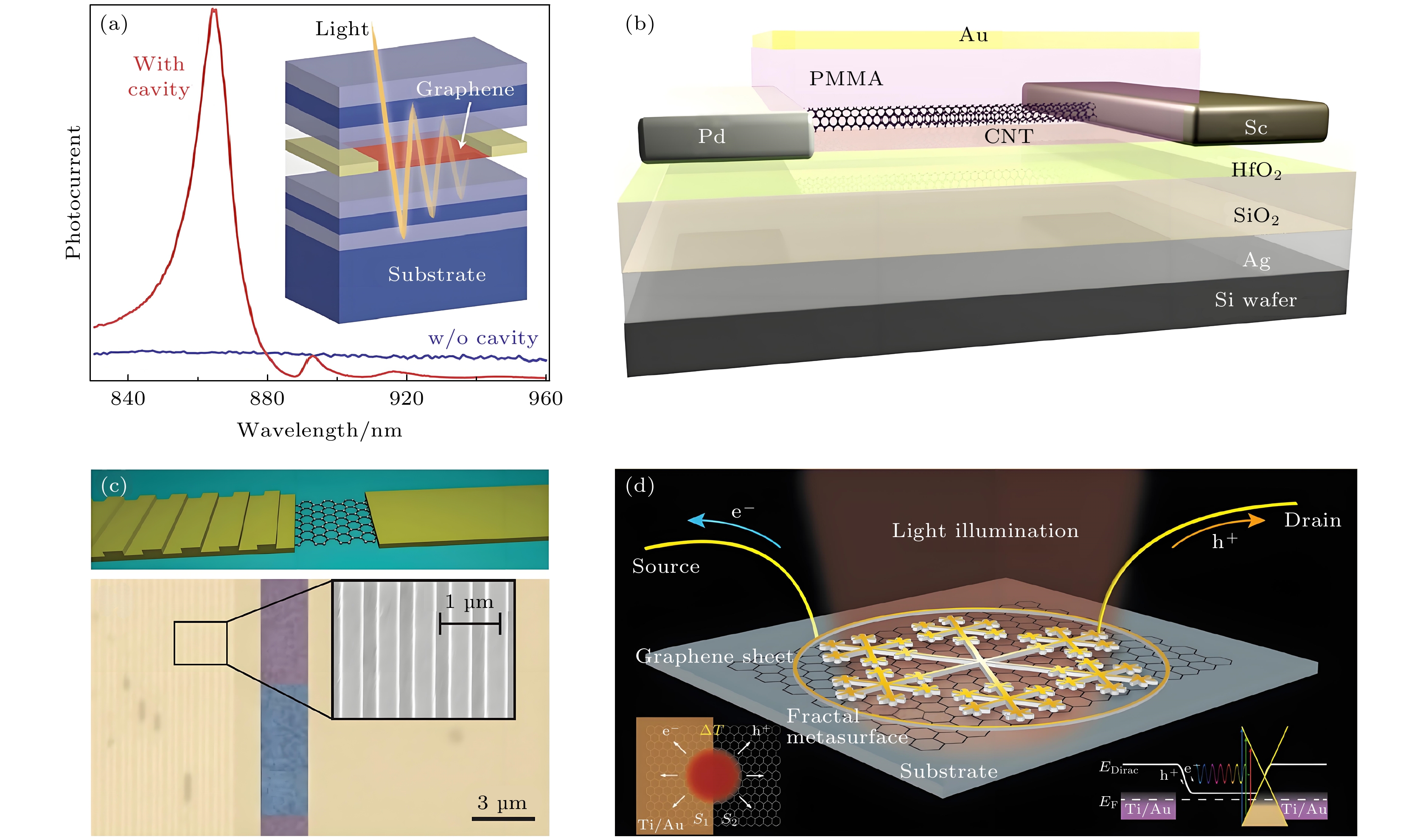 Figure 6. (a) Schematic drawing of a graphene microcavity photodetector, reproduced with permission from Ref.[24]; (b) schematic representation of a single-tube diode-type photodetector integrated with F–P microcavity, reproduced with permission from Ref.[14]; (c) metal-graphene-metal photodetector with plasmonic grating coupler, reproduced with permission from Ref.[45]; (d) enhanced graphene photodetector with fractal metasurface, reproduced with permission from Ref.[46].