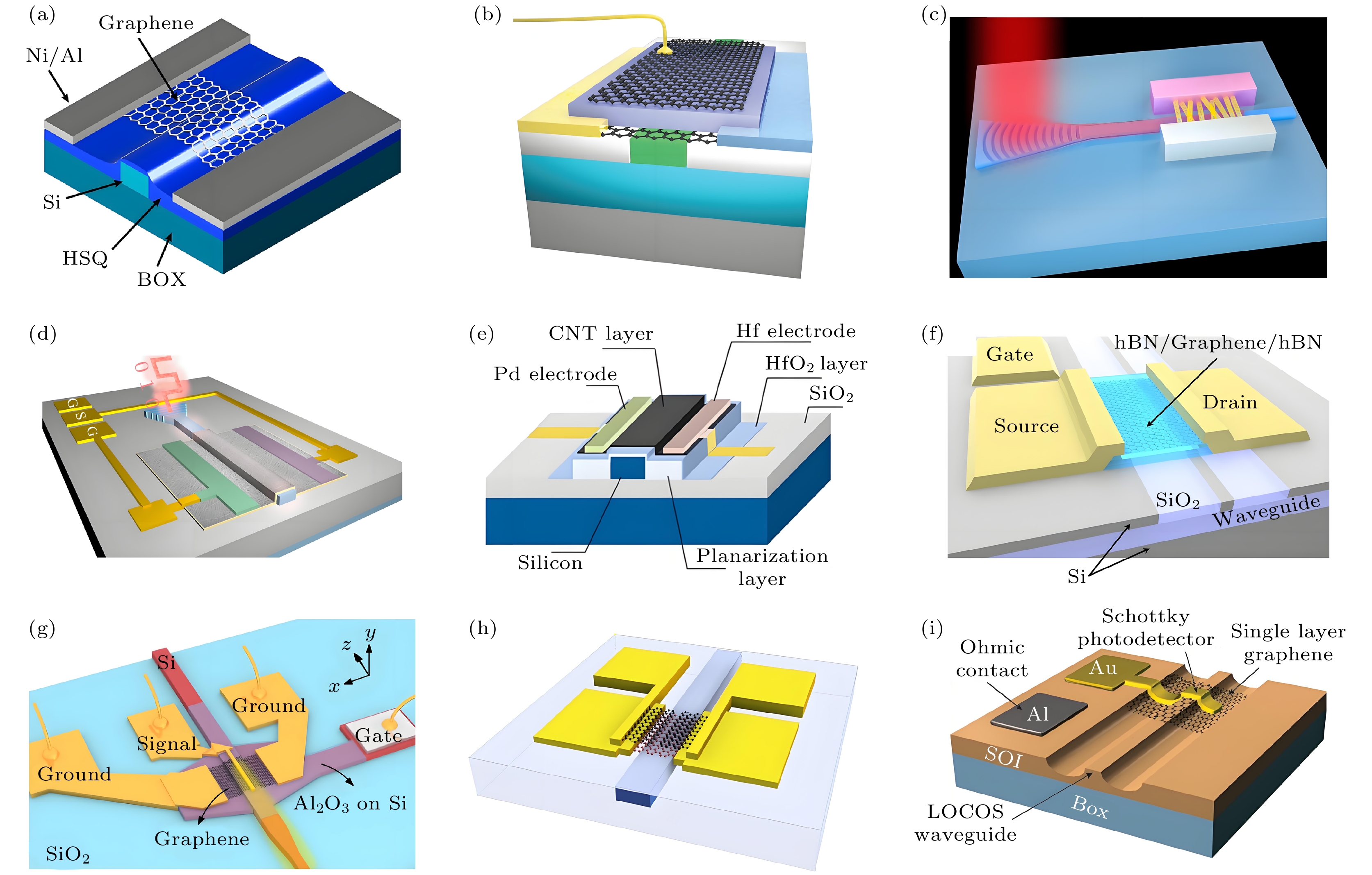 图 7 (a) 非对称接触配置下硅波导上集成的石墨烯光电探测器, 出自文献[49], 已获得授权; (b) 平面化波导上集成的双层石墨烯调制器/探测器的示意图, 出自文献[51], 已获得授权; (c) 波导集成碳纳米管光电二极管结构示意图, 出自文献[52], 已获得授权; (d) 低暗电流、48 GHz带宽的硅波导集成CNT光电探测器, 出自文献[53], 已获得授权; (e) 基于平面化硅波导的高速CNT光电探测器, 出自文献[54], 已获得授权; (f) 埋入硅波导上的hBN/SLG/hBN光电探测器, 出自文献[55], 已获得授权; (g) 高性能硅-石墨烯混合等离激元波导光电探测器的结构, 出自文献[57], 已获得授权; (h) PTE石墨烯光电探测器的3D示意图, 出自文献[58], 已获得授权; (i) 硅-石墨烯等离子体肖特基光电探测器, 出自文献[59], 已获得授权