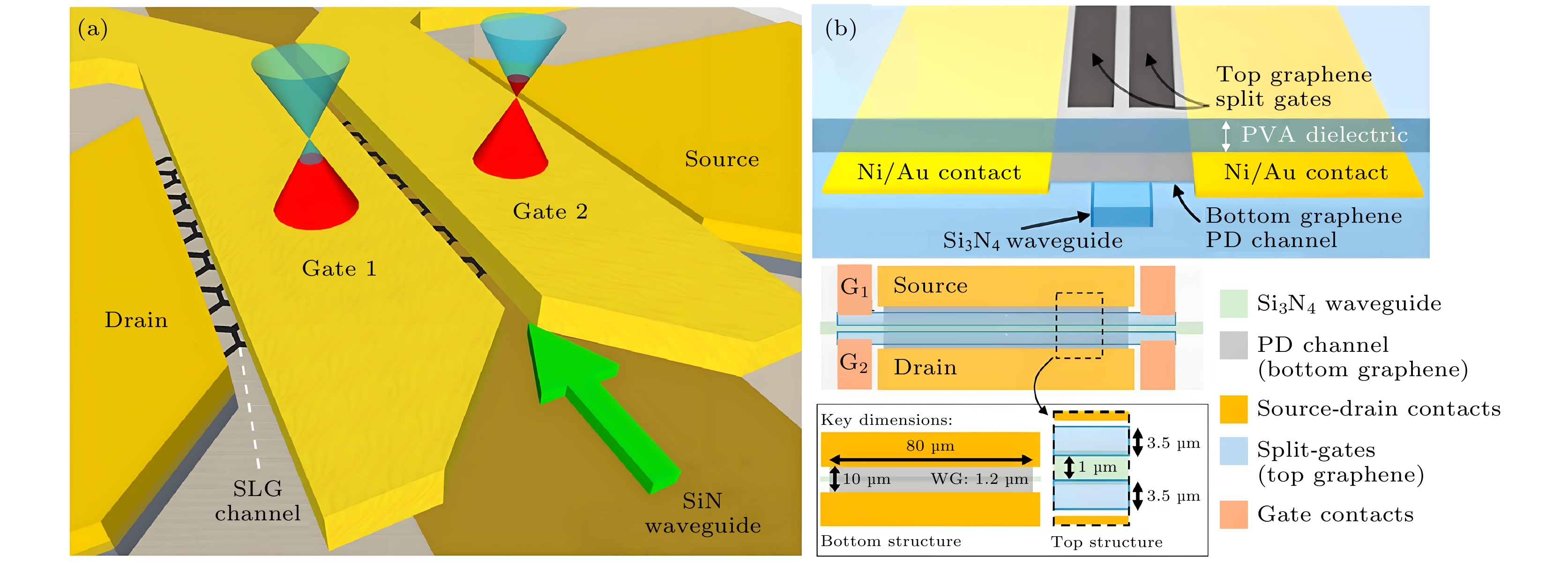 图 8 (a) 波导集成等离子体增强石墨烯光电探测器, 出自文献[66], 已获得授权; (b) 无源光子波导上具有聚合物栅极电介质的超快、零偏压石墨烯光电探测器, 出自文献[65], 已获得授权
