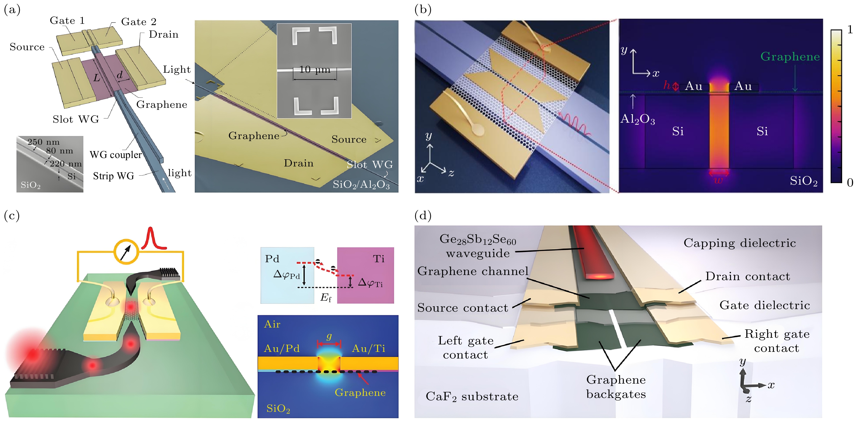 Figure 9. (a) The graphene photodetector based on a slot-waveguide, reproduced with permission from Ref.[69]; (b) graphene photodetector employing double slot structure, reproduced with permission from Ref.[70]; (c) the graphene-plasmonic integrated photodetector, reproduced with permission from Ref.[74]; (d) waveguide-integrated mid-infrared photodetection using graphene on a scalable chalcogenide glass platform, reproduced with permission from Ref.[72].