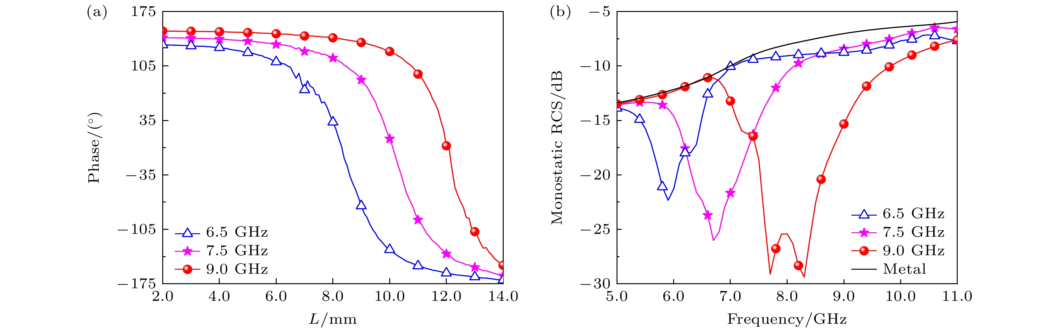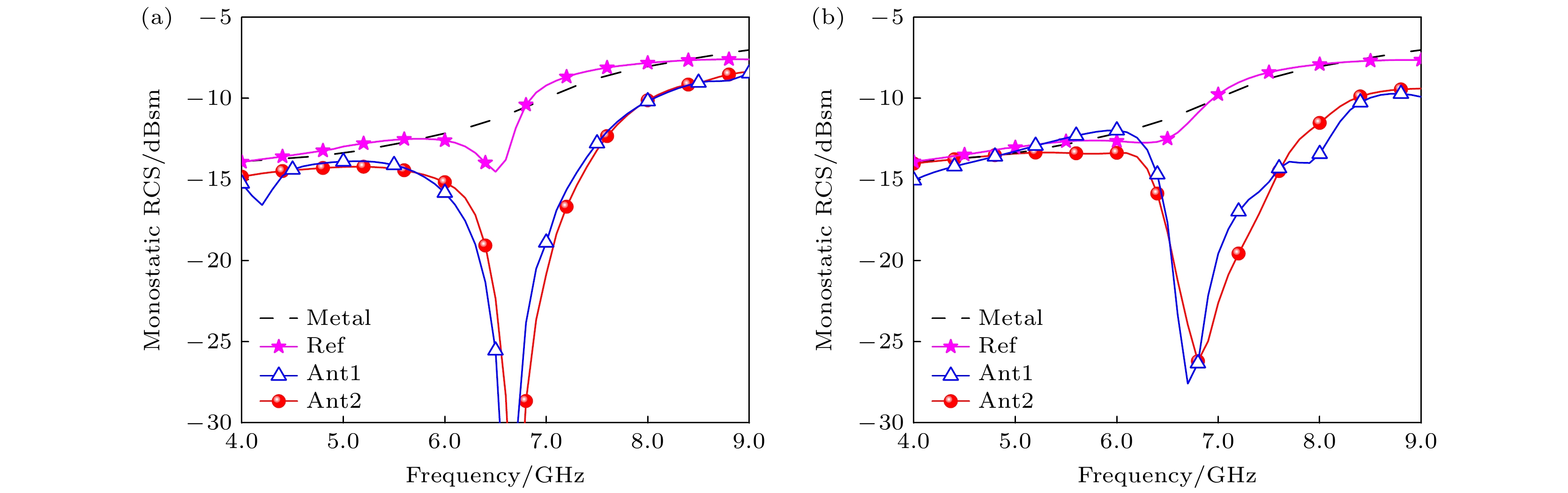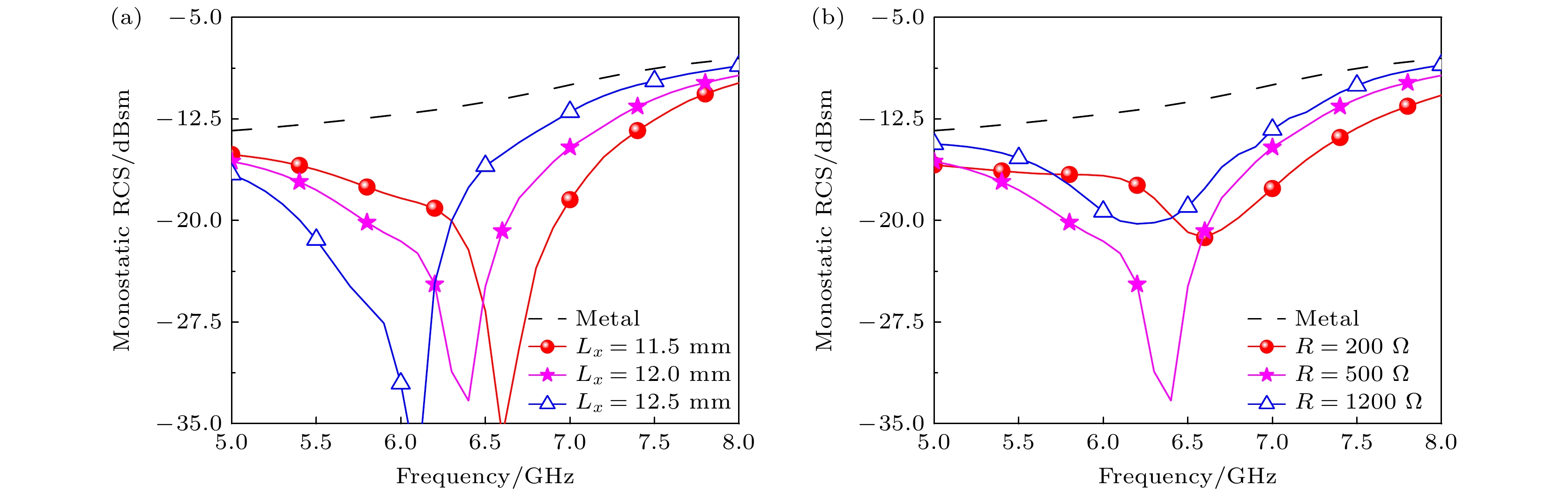 图 3 x极化表面单站RCS曲线 (a) Ly1 = 11.9 mm, Ly2 = 10.5 mm, Ly3 = 9.6 mm, Ly4 = 3.8 mm, R = 500 Ω; (b) Lx = 12.0 mm, Ly1 = 11.9 mm, Ly2 = 10.5 mm, Ly3 = 9.6 mm, Ly4 = 3.8 mm