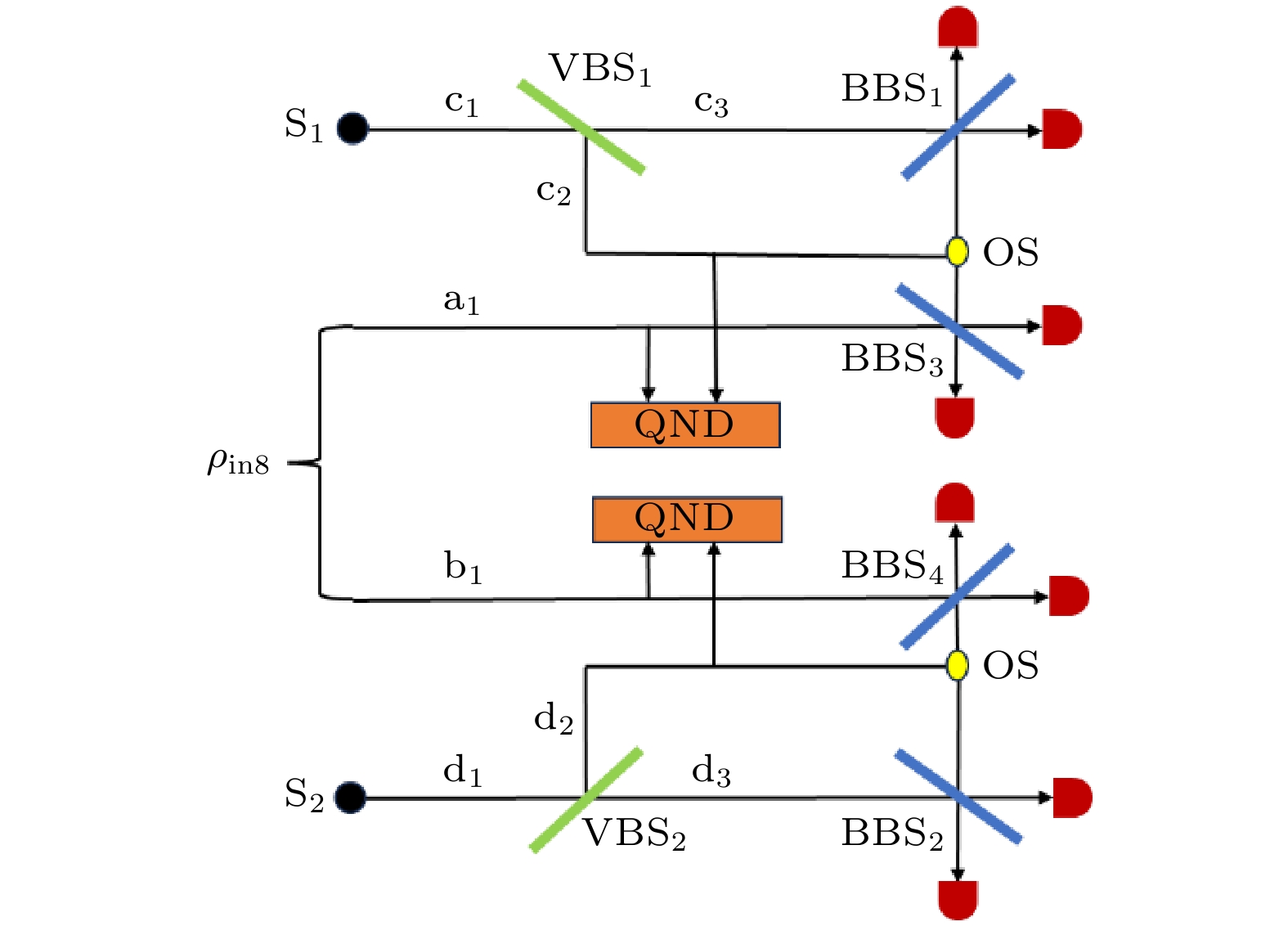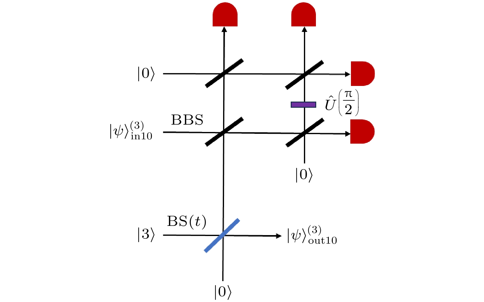 Figure 10. Schematic diagram of NLA protocol based on generalized three-order quantum scissors (3-QS)[29]. The NLA protocol depends on the four-port joint photon measurement. When three of the four ports each have a single photon and the last port does not have photon, the NLA protocol is successful. $ \pi /2 $ phase shift should be present on the photon in one of the paths.