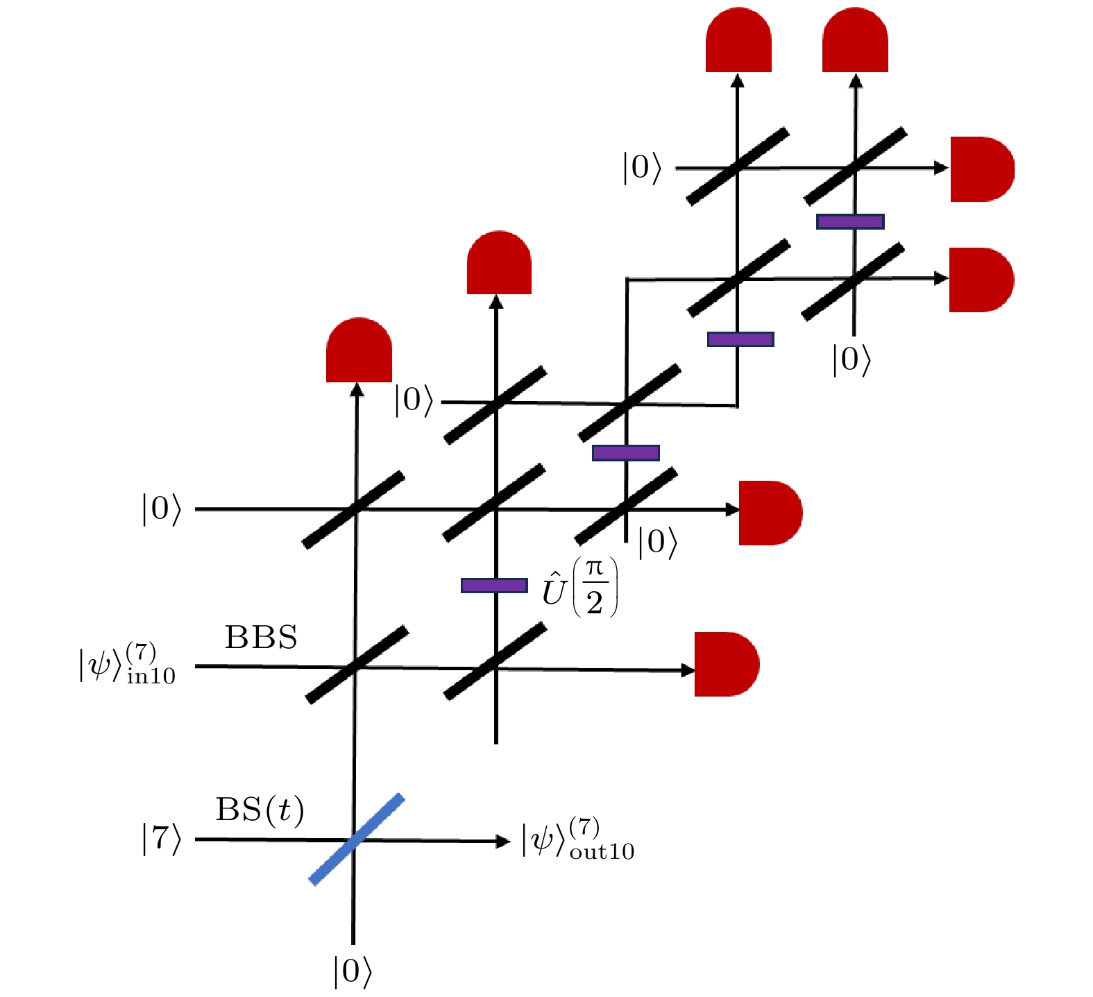 图 11 基于7光子QS(7-QS)的NLA方案原理图[29]. 本方案在BS(t)的一个输入端输入7光子辅助态. 运行8端口单光子测量方案. 当其中7个端口探测到单光子, 另一个端口没有探测到光子时, 方案运行成功