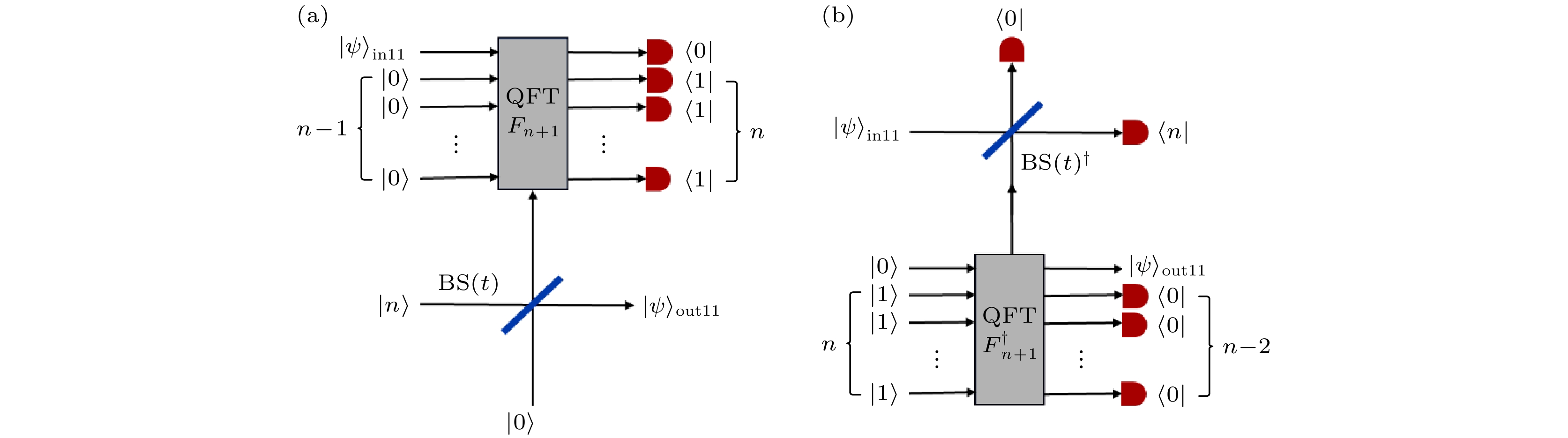 Figure 12. Schematic diagram of NLA scheme based on n-photon QS [32]: (a) $\left| n \right\rangle $ bunched photons are used as auxiliary state (BP protocol); (b) n single photons ${ \otimes ^n}\left| 1 \right\rangle $ are used as auxiliary state (SP protocol).