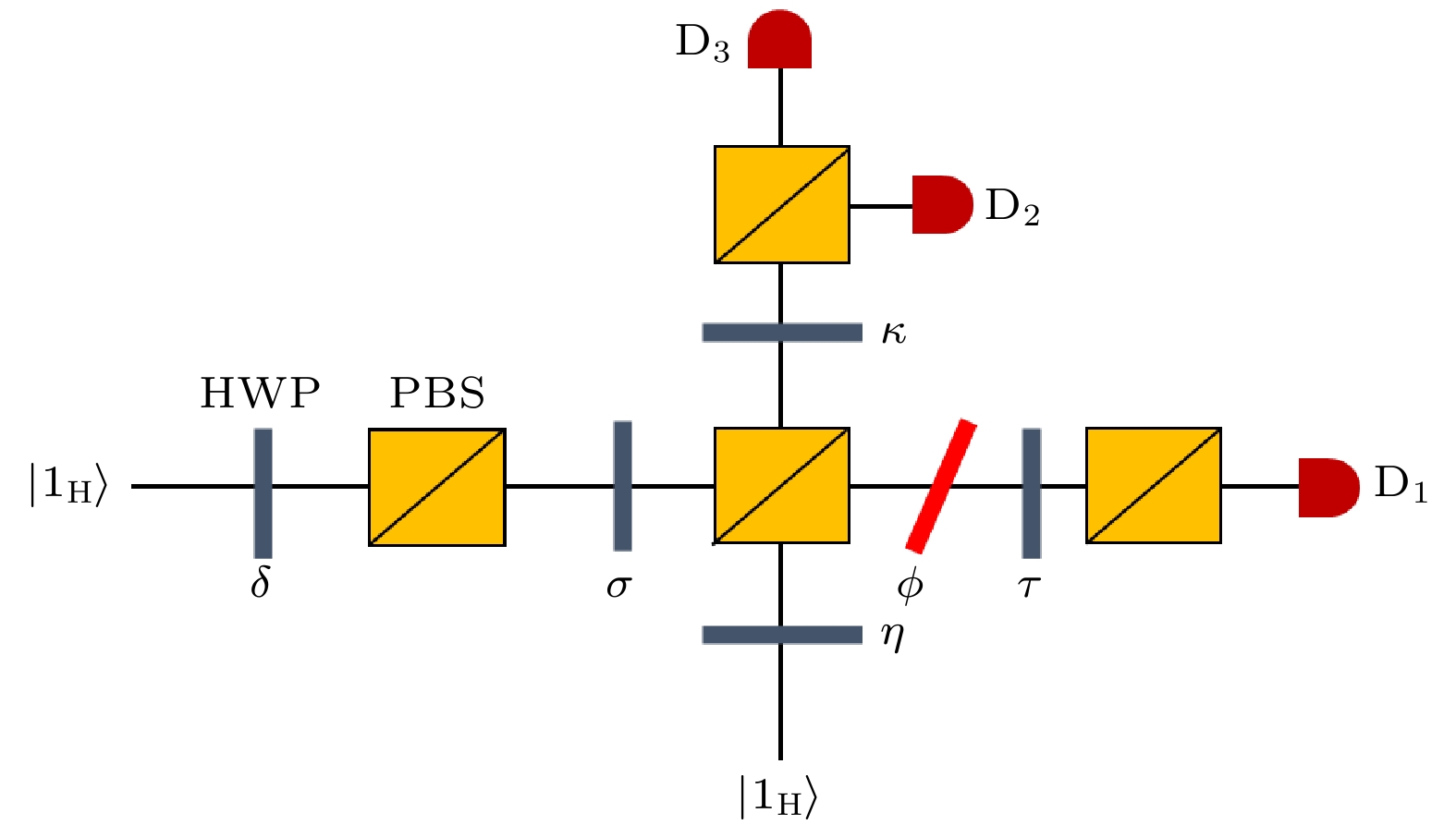 图 10 基于3光子QS(3-QS)的NLA方案示意图[29]. 本方案采用4端口单光子测量. 在其中3个端口探测到单光子, 另一个端口没有探测到光子的情况下, 该NLA方案运行成功. 当方案运行成功时, 需要对其中一条路径上的光子施加$ \pi /2 $的相移