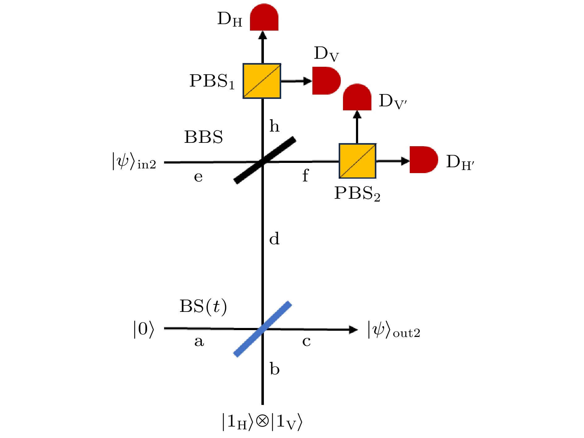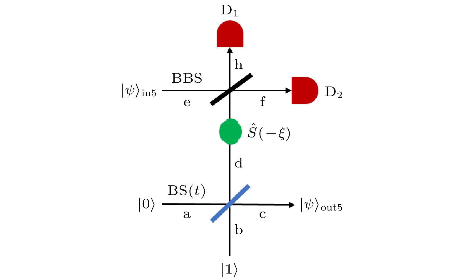 图 1 单光子QS-NLA方案原理图[8]. BS(t)和BBS分别是透射率为t和1/2的分束器, D1, D2为理想的单光子探测器. 输入态和辅助单光子态分别从空间模式e和b进入QS. 当探测器D1, D2只有一个探测到单光子, 另一个没有探测到光子时, 该NLA方案运行成功