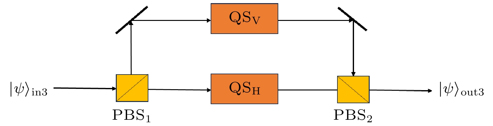 Figure 3. Schematic diagram of a single-photon polarization qubit QS-NLA protocol[18]. QSH and QSV are ideal single-photon quantum scissors with the auxiliary photons $\left| {{1_{\text{H}}}} \right\rangle $ and $\left| {{1_{\text{V}}}} \right\rangle $, respectively[8], and PBS is the polarization beam splitter.