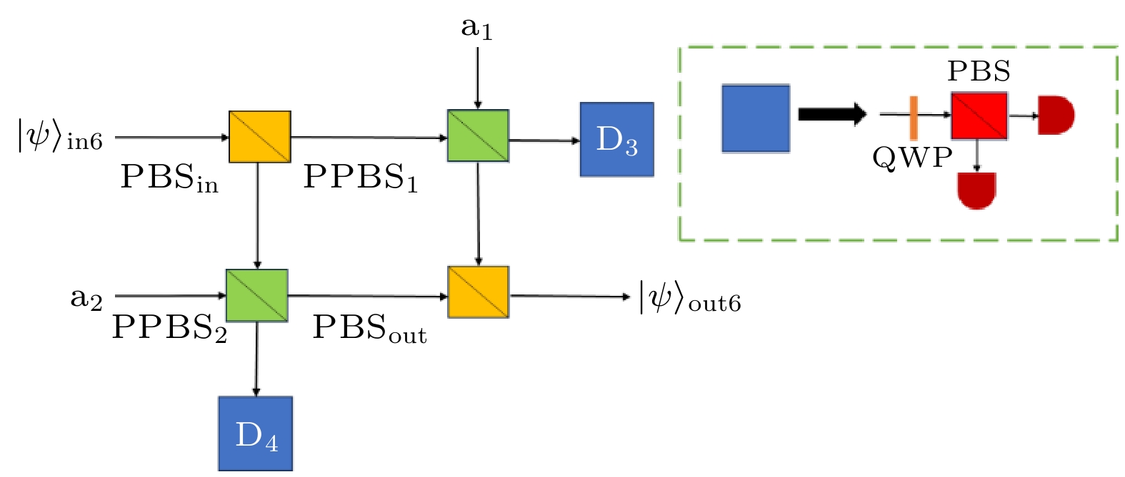 Figure 6. Schematic diagram of a polarized qubit NLA scheme based on entanglement assistance [16]. PPBS1, PPBS2 stand for partially polarized beam splitter. D3 and D4 are standard polarization analysis blocks[45], each consisting of a quarter wave plate (QWP), a PBS, and two ideal single-photon detectors.
