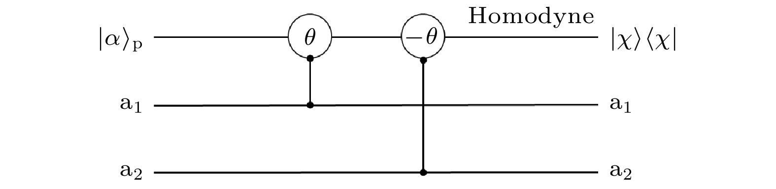 图 7 利用交叉克尔介质构造的非破坏性测量(quantum non-demolition detection, QND)门原理图[20]. 空间模式a1(a2)的光子与相干态$ {\left|\alpha \right\rangle}_{\mathrm{p}} $一起通过交叉克尔介质. 空间模式a1中的单光子将使相干态${\left| \alpha \right\rangle _{\text{p}}}$获得$ \theta $的相移, 而空间模式a2中的单光子将使相干态${\left| \alpha \right\rangle _{\text{p}}}$获得$ - \theta $的相移