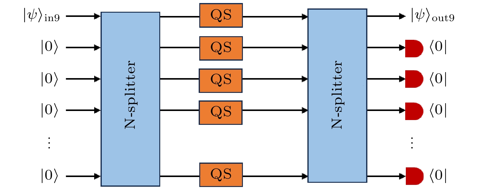 Figure 9. Schematic diagram of multiple 1-QS parallel NLA schemes[8]. The N-splitter is an array of BBSs, which can split the input state into N spatial paths. The second N-splitter is used to couple the beams from N output spatial paths. If all the QSs obtain the successful detector responses and no photons is detected at the other output ports, the protocol is successful.