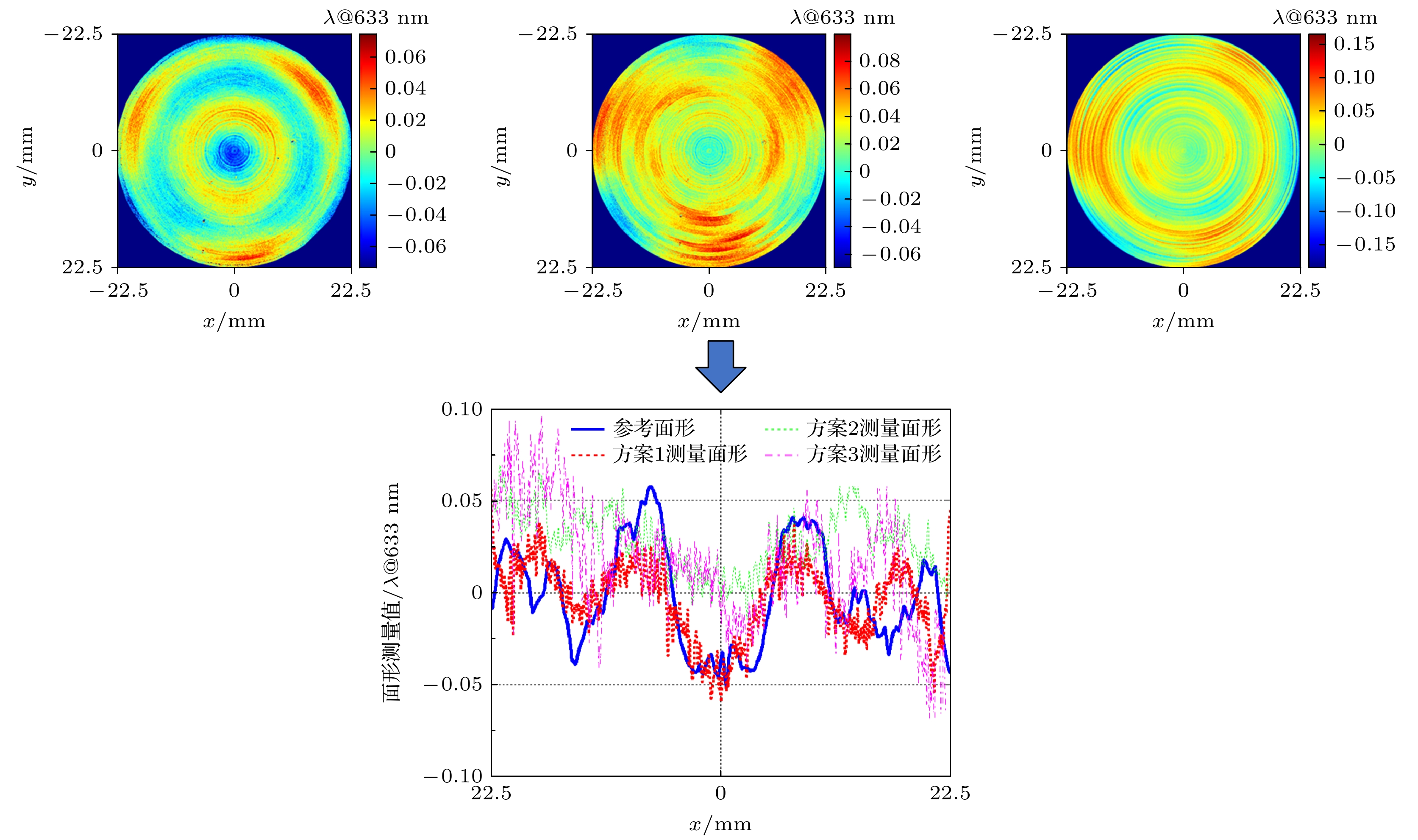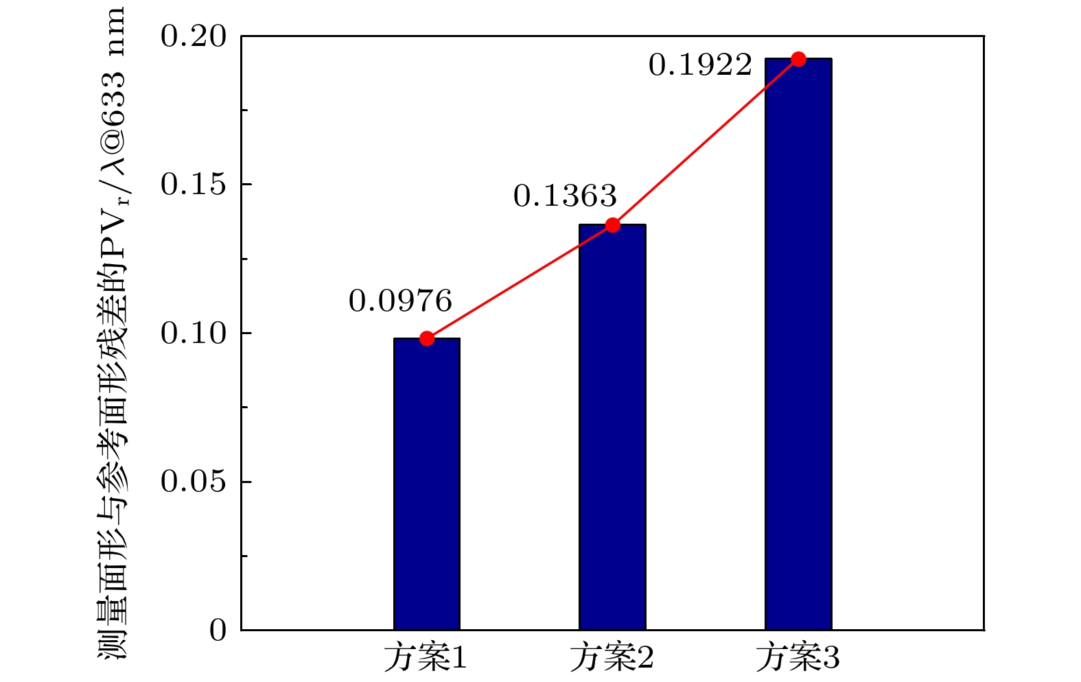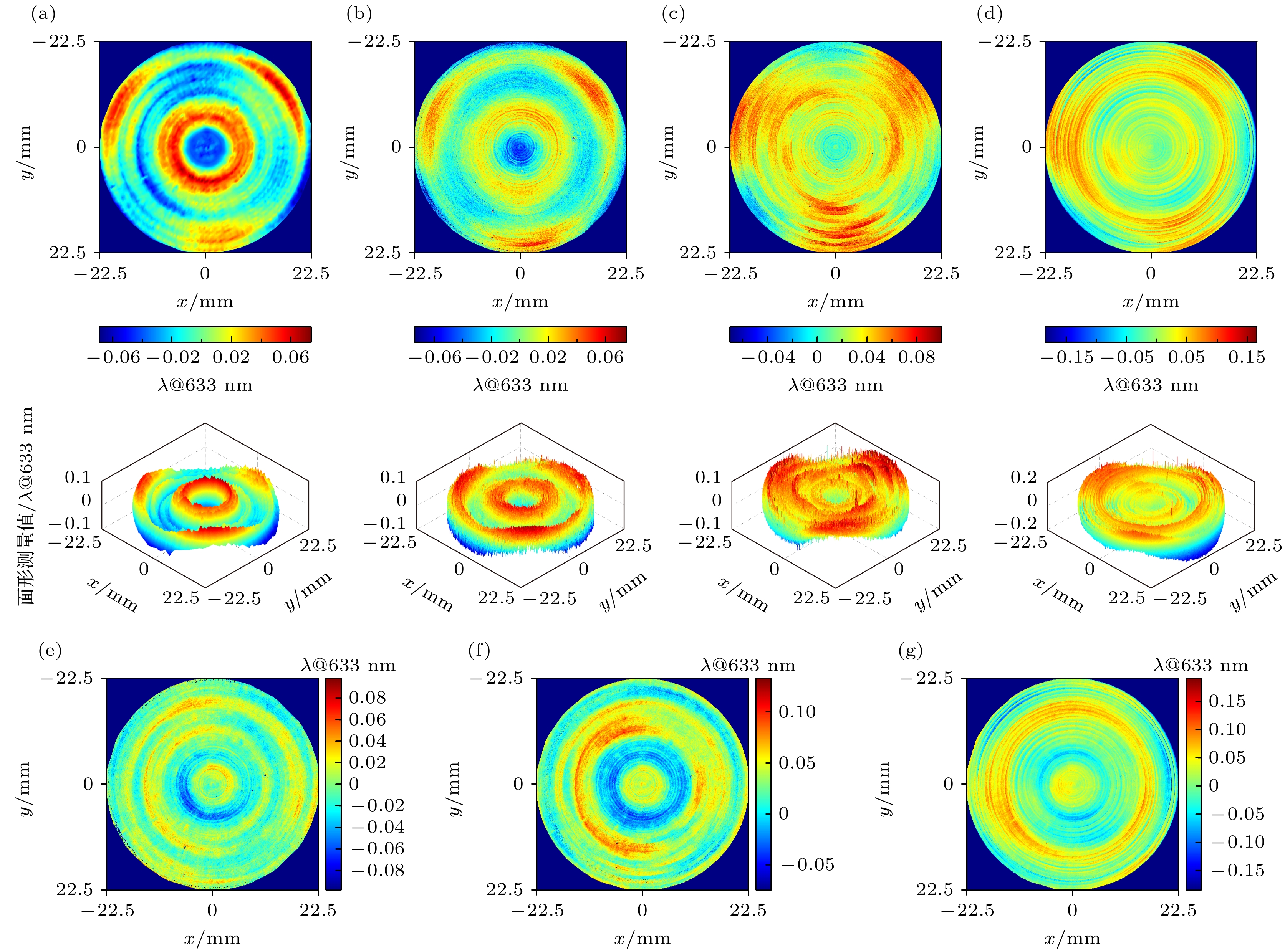 图 8 非球面待测镜面形的参考测量结果以及使用方案1—3得到的拼接测量结果 (a) 参考测量结果; (b) 方案1(本文所提出的方法)的测量结果; (c) 方案2的测量结果; (d) 方案3的测量结果; (e) 图(b)结果与(a)结果的残差面形图; (f) 图(c)结果与图(a)结果的残差面形图; (g) 图(d)结果与图(a)结果的残差面形图