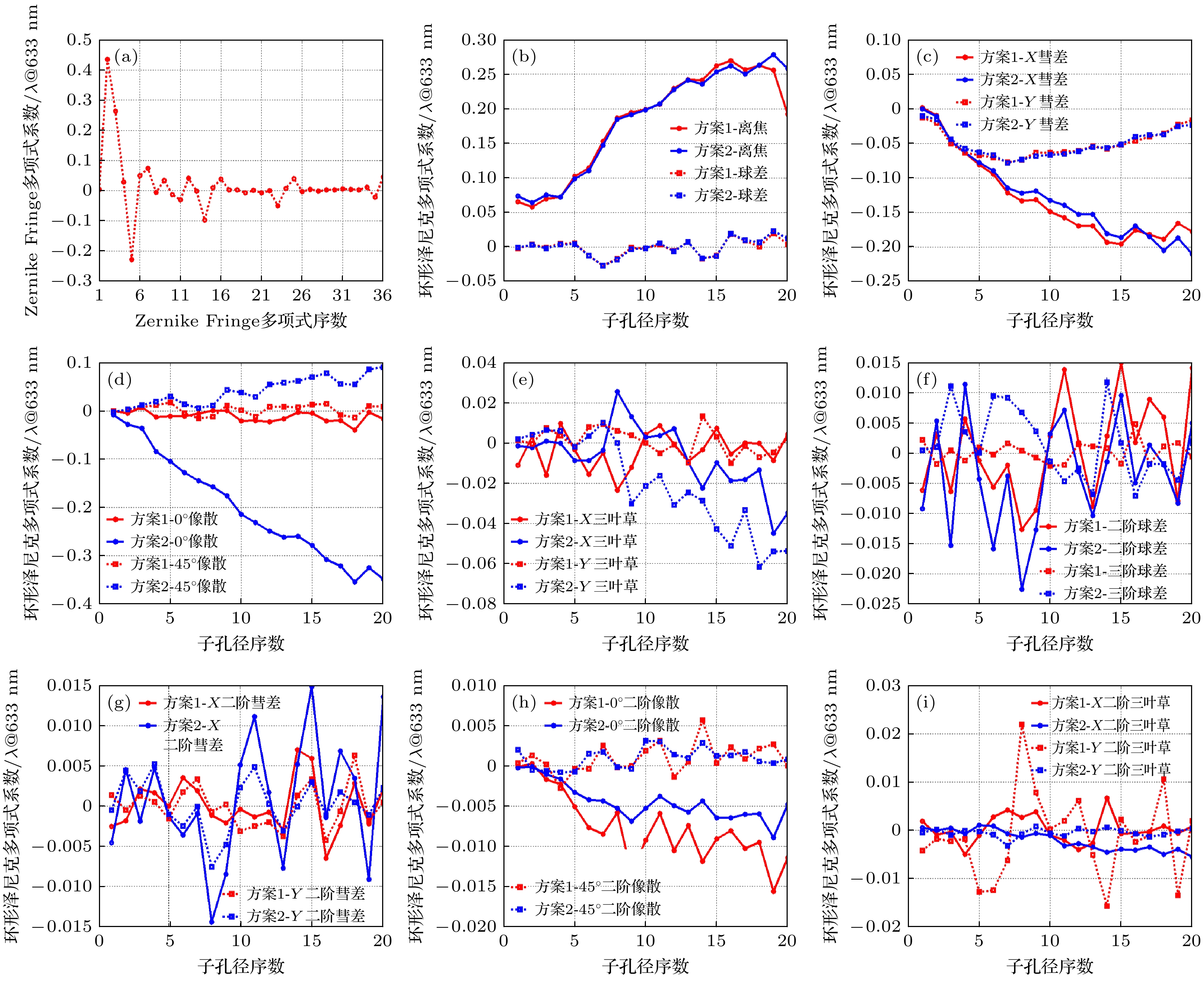 图 12 全口径和各子孔径泽尼克多项式系数曲线 (a) 全口径36项Zernike Fringe多项式系数; (b) 子孔径离焦和球差项系数; (c) 子孔径彗差项系数; (d) 子孔径像散项系数; (e) 子孔径三叶草像差项系数; (f) 子孔径高阶球差项系数; (g) 子孔径二阶彗差项系数; (h) 子孔径二阶像散项系数; (i) 子孔径二阶三叶草像差项系数