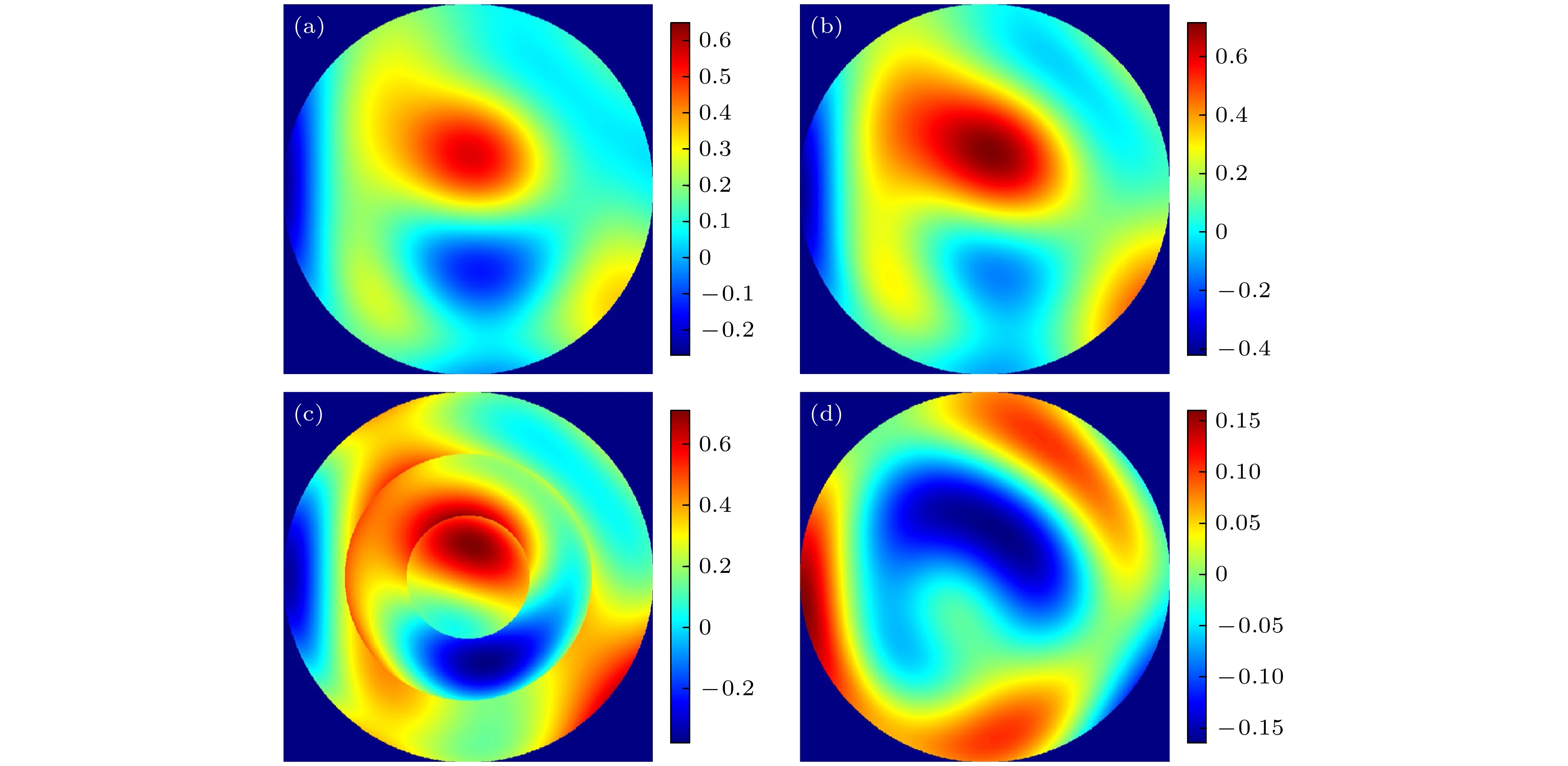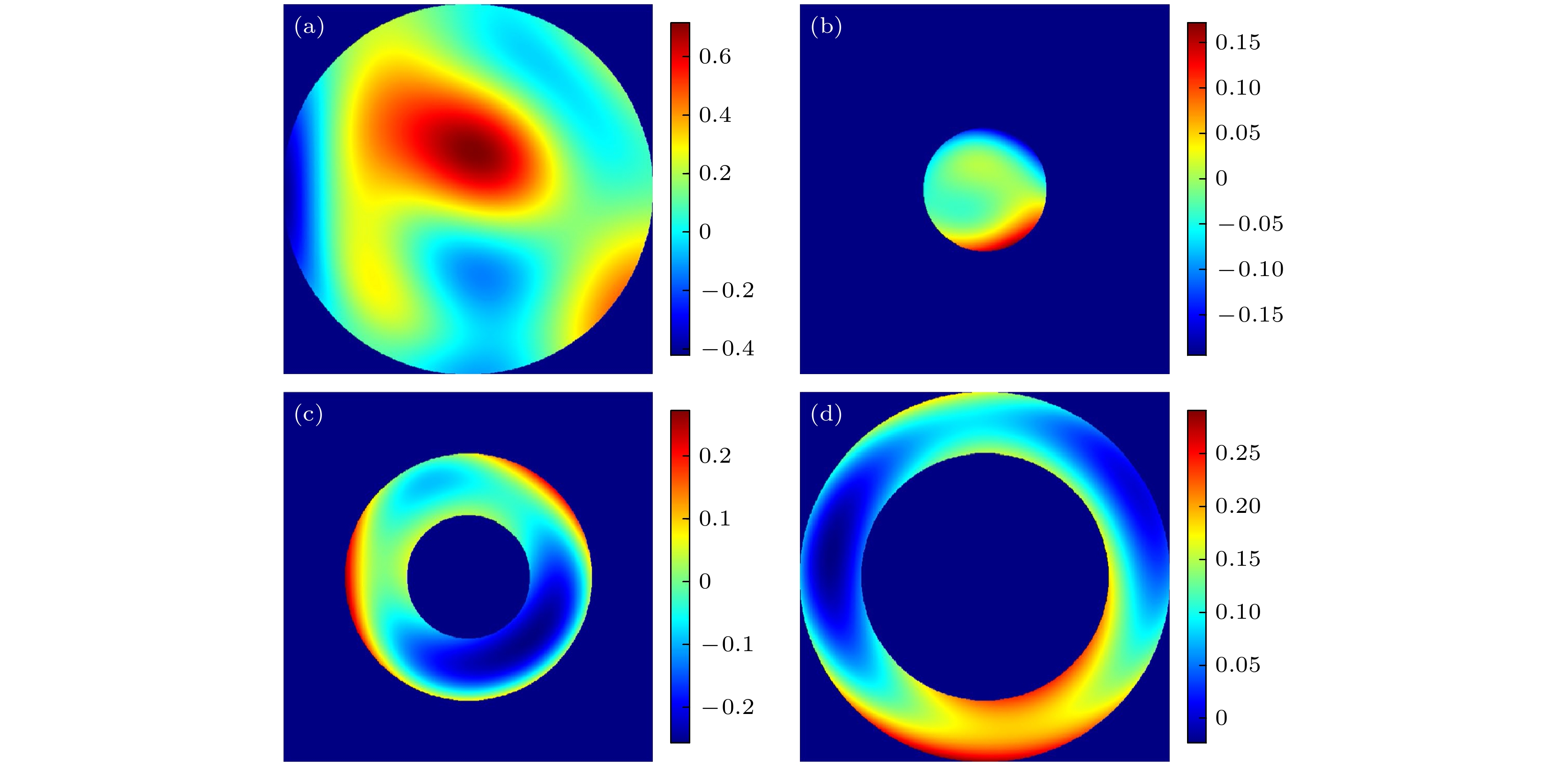 图 3 仿真生成的待测镜面形和测量误差 (a) 圆形全口径面形; (b) 第1个子孔径测量误差; (c) 第2个子孔径测量误差; (d) 第3个子孔径测量误差