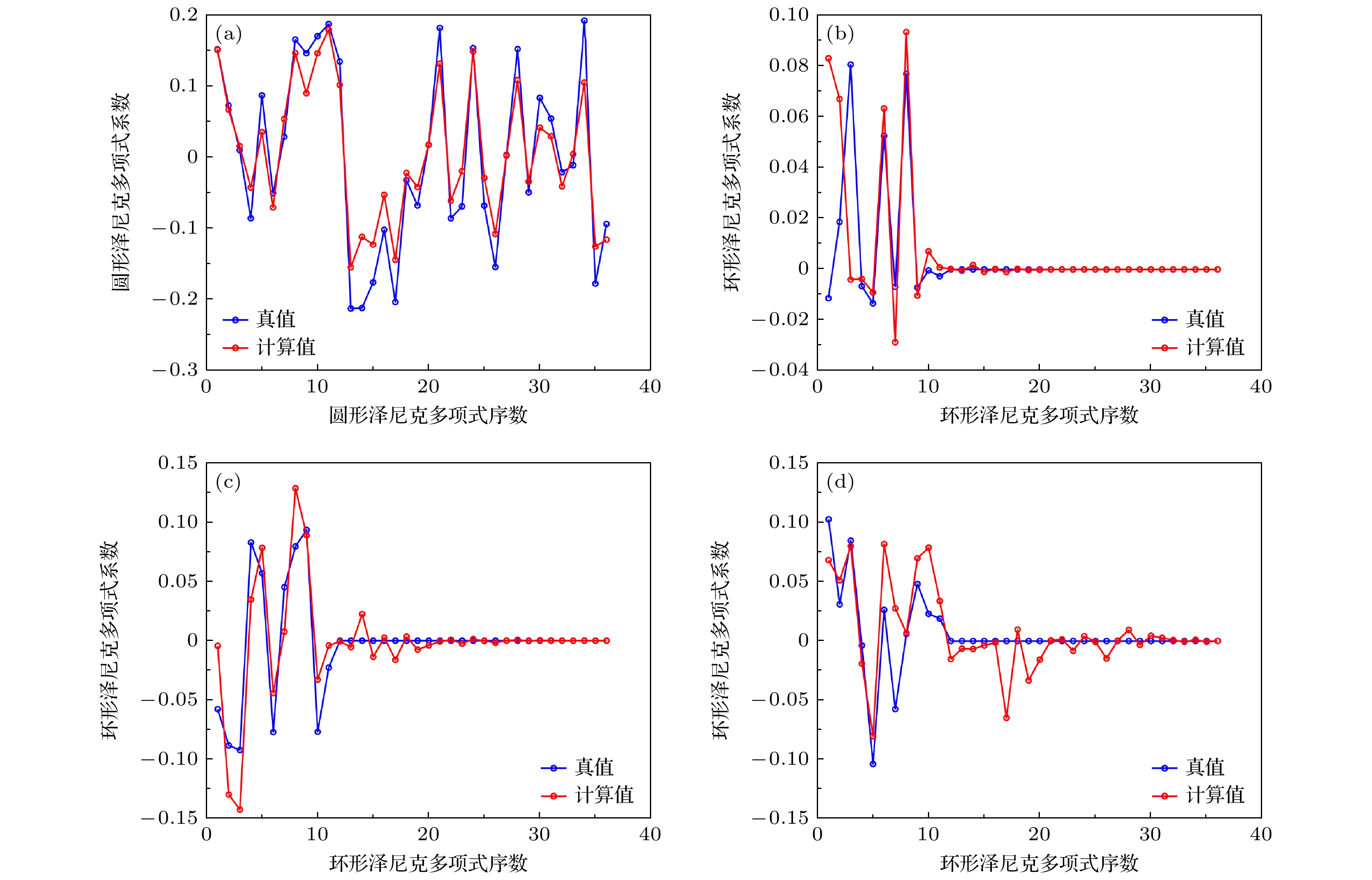 图 5 泽尼克多项式系数的计算值与真值对比 (a) 全口径圆形泽尼克多项式系数; (b) 第1子孔径环形泽尼克多项式系数; (c) 第2子孔径环形泽尼克多项式系数; (d) 第3子孔径环形泽尼克多项式系数