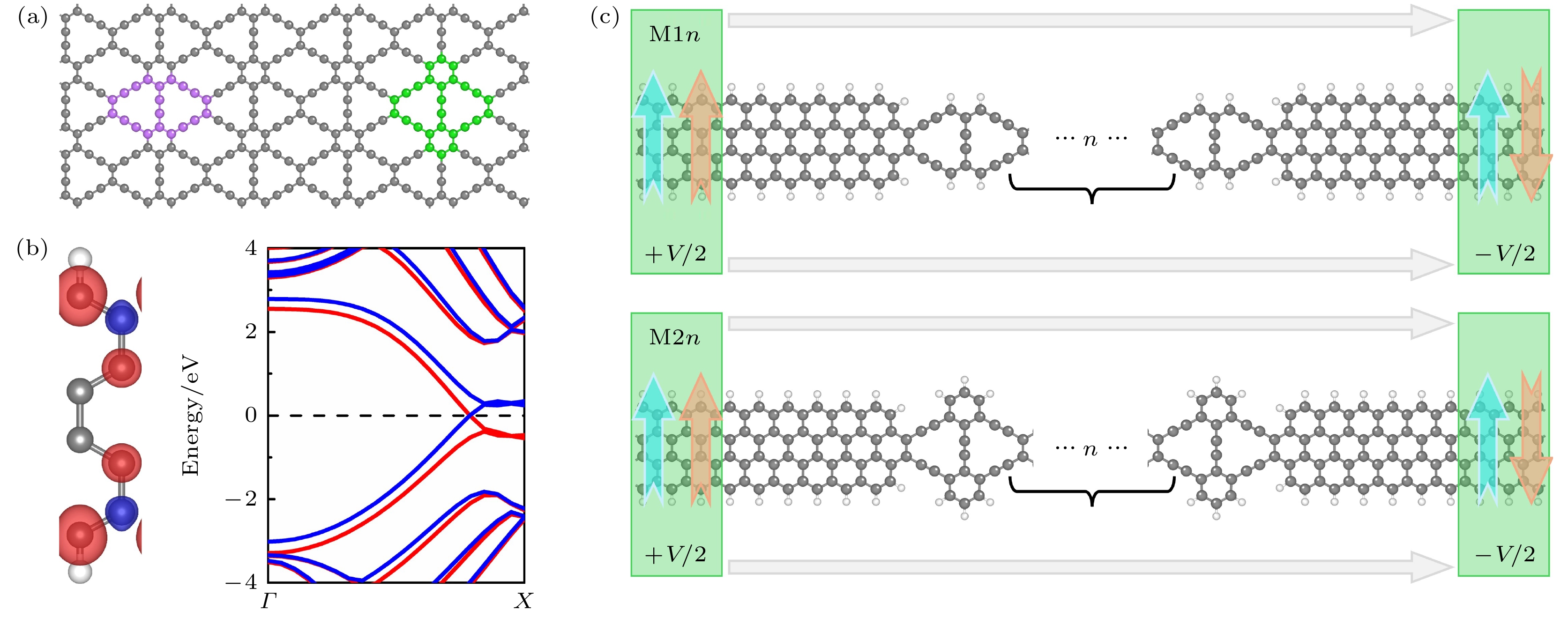 图 1 器件各组分和器件整体的结构图 (a) 6,6,12-GY的结构图, 紫色和绿色碳原子表示裁剪的两种不同纳米点类型; (b) ZGNRs的自旋差分电荷和能带结构图, 红色和蓝色表示净自旋向上或自旋向下; (c) 设计的两种类型的MMTJs