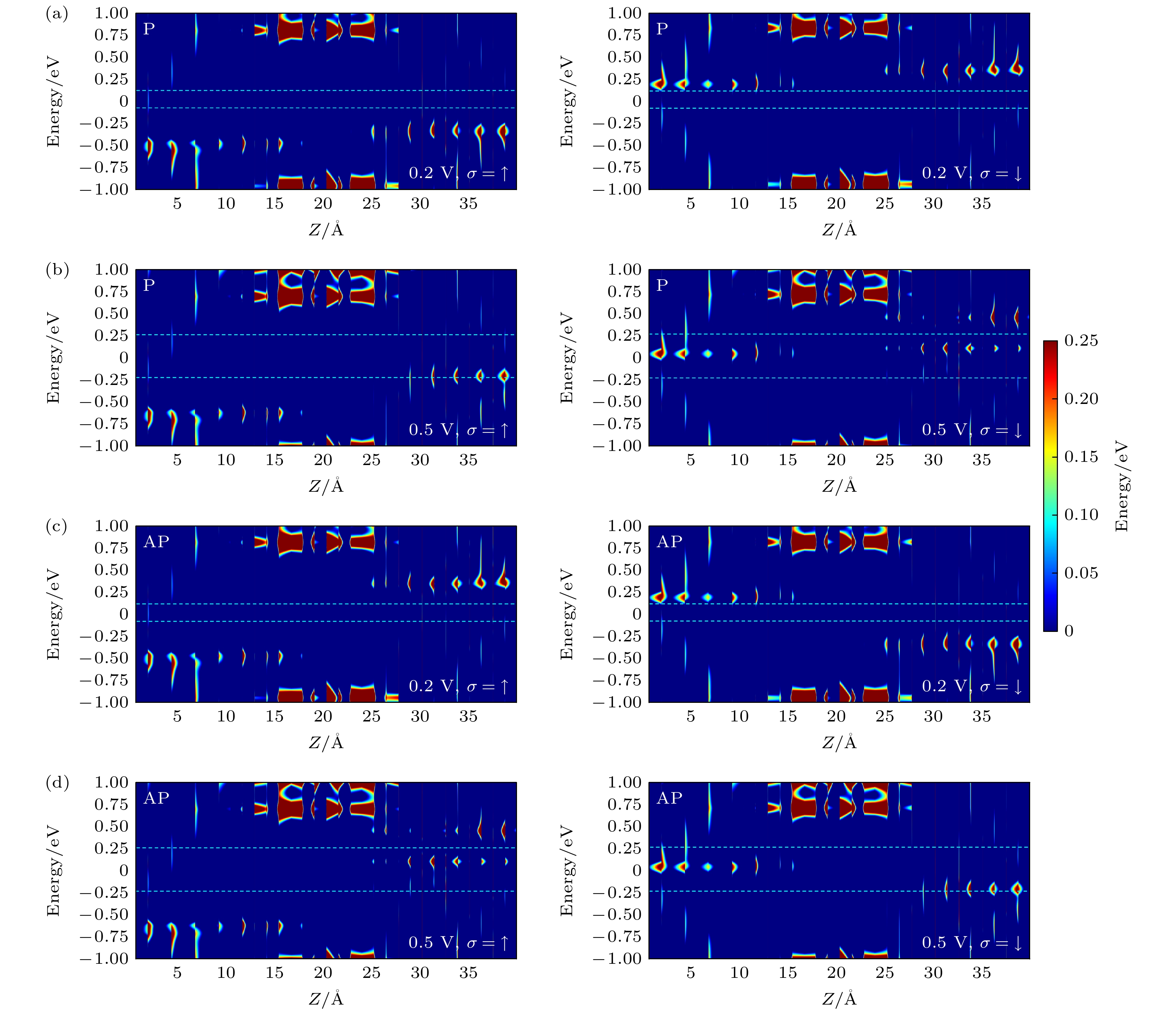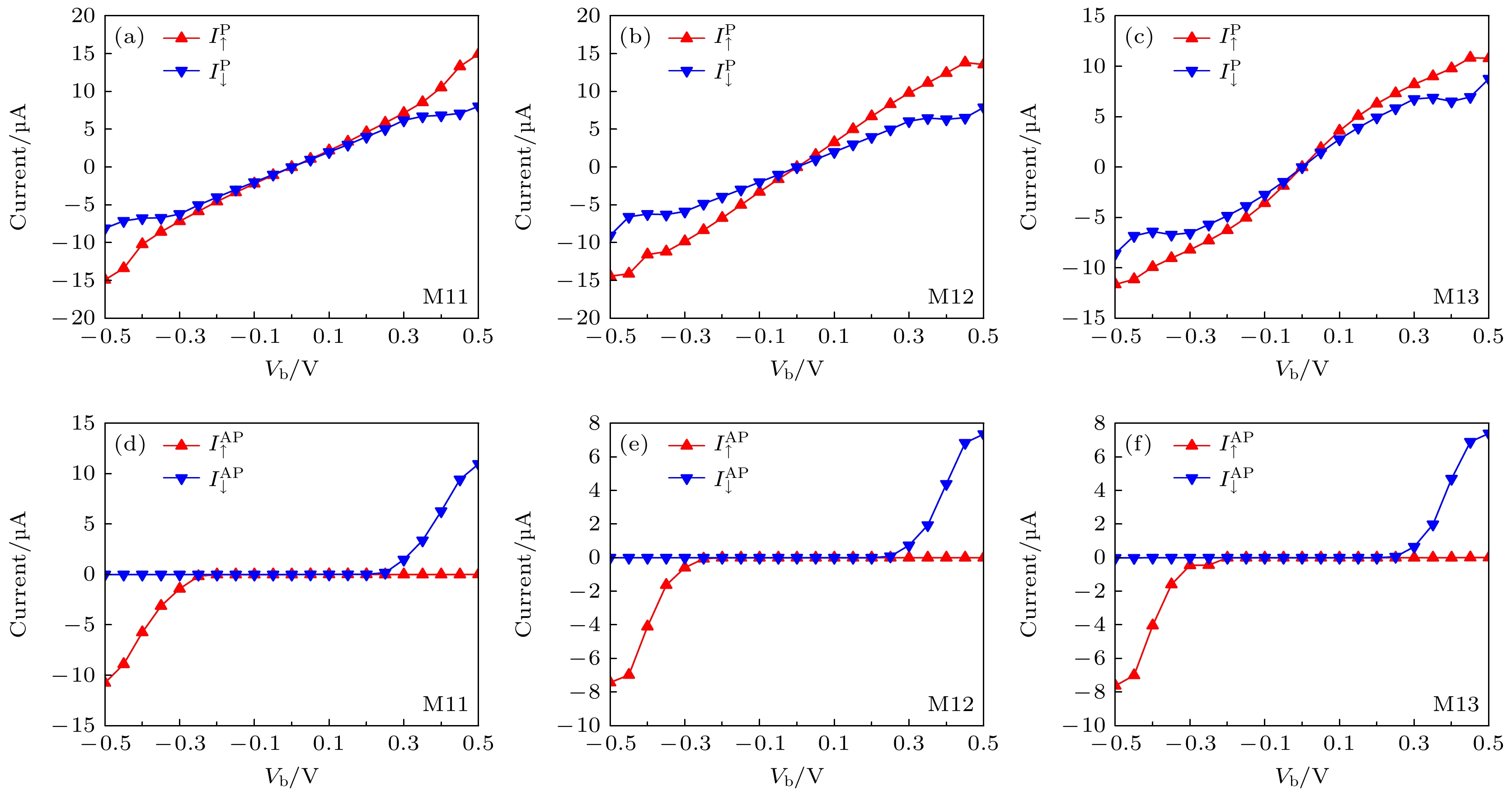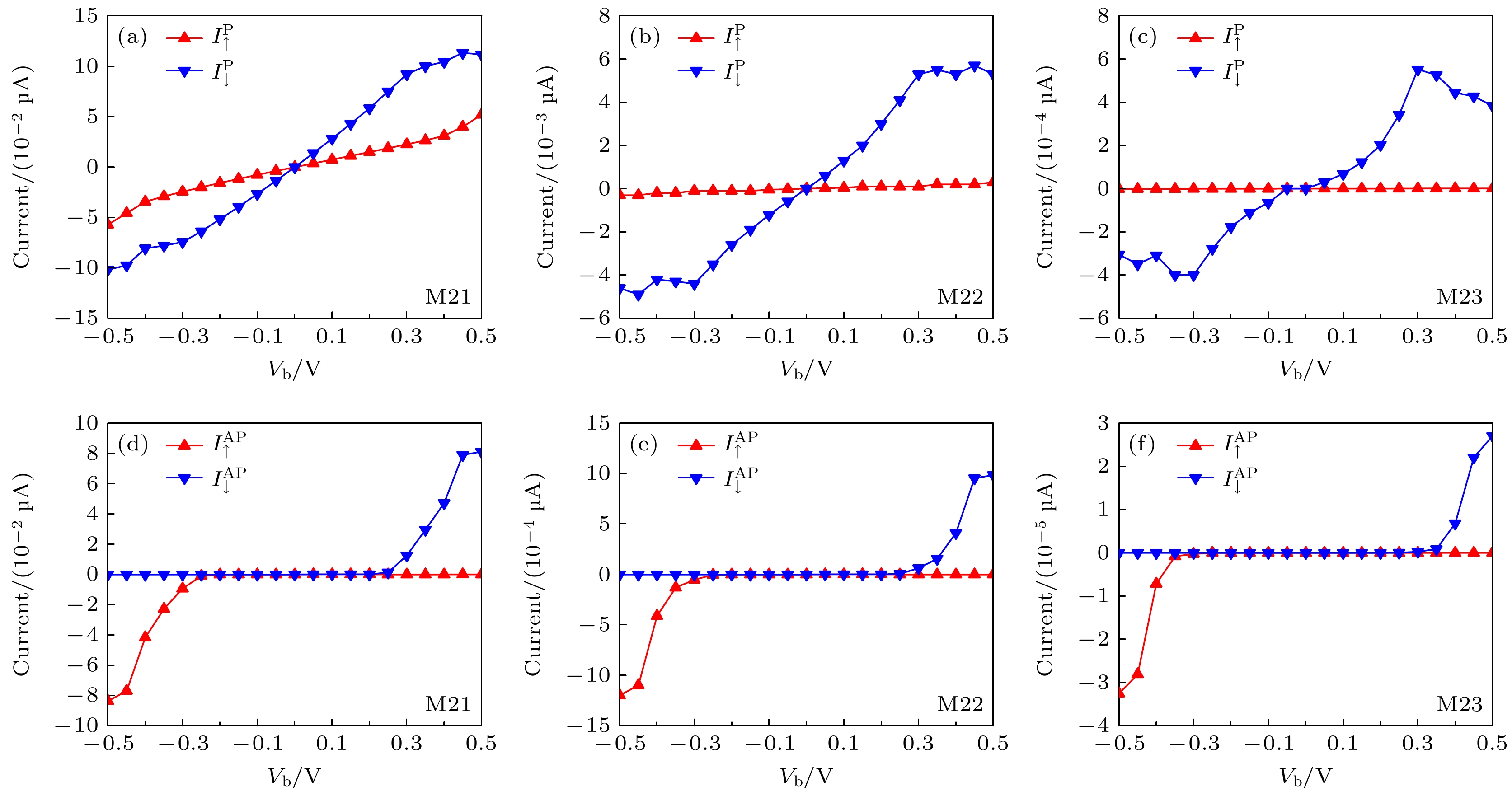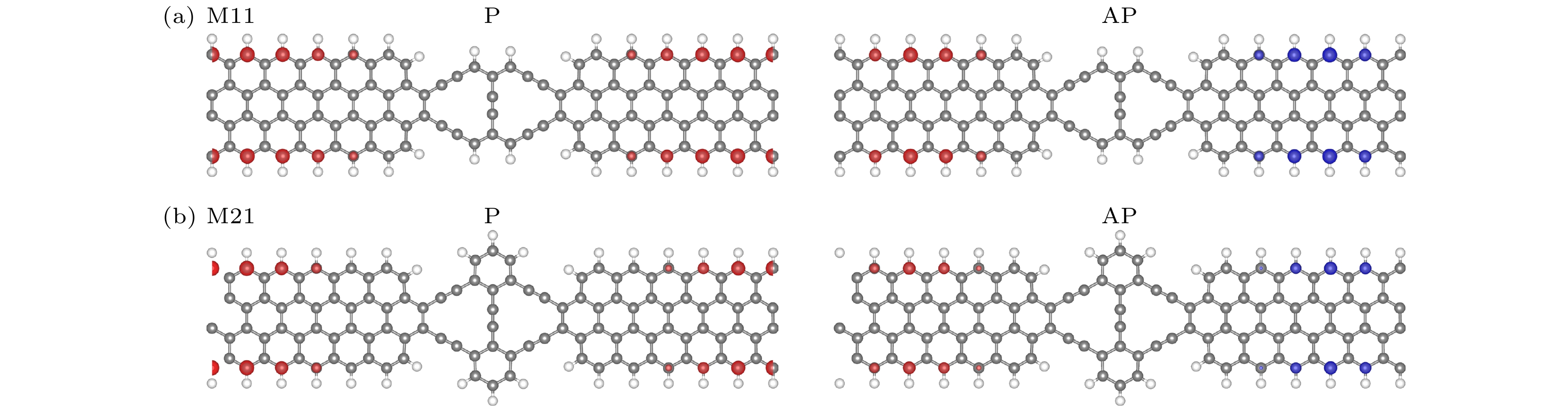 图 2 P和AP构型下的自旋差分密度 (a) 器件M11; (b) 器件M21. 红色和蓝色表示净的自旋向上和自旋向下分量. 等值面设置为±0.008 e/Å3
