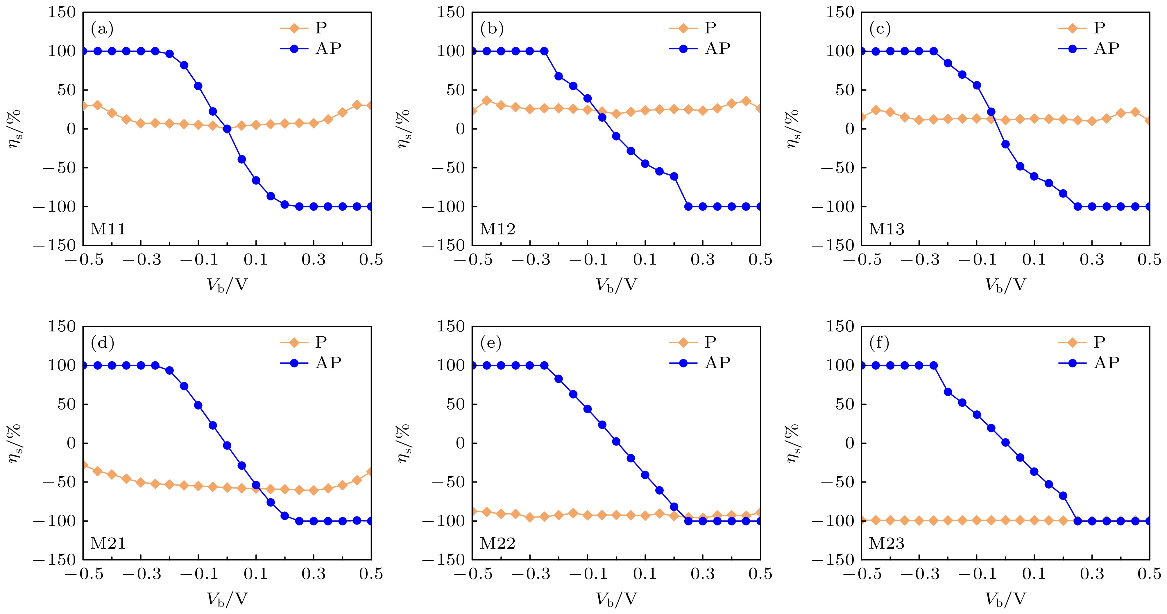 图 9 器件M2n在P和AP构型下的自旋相关透射谱, 虚线表示偏压窗 (a) M11, (c) M12和 (e) M13在P构型下的透射谱; (b) M11, (d) M12和 (f) M13在AP构型下的透射谱