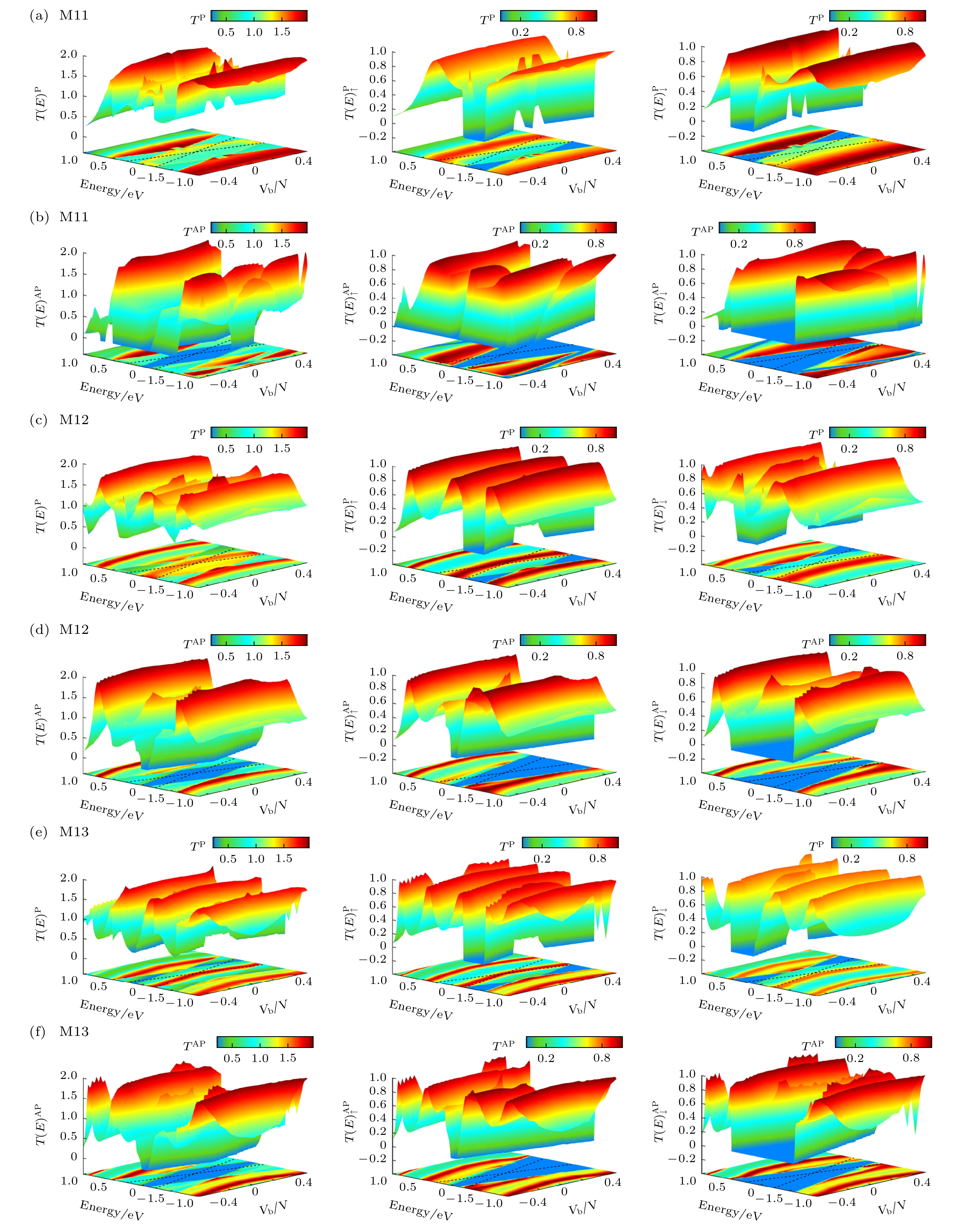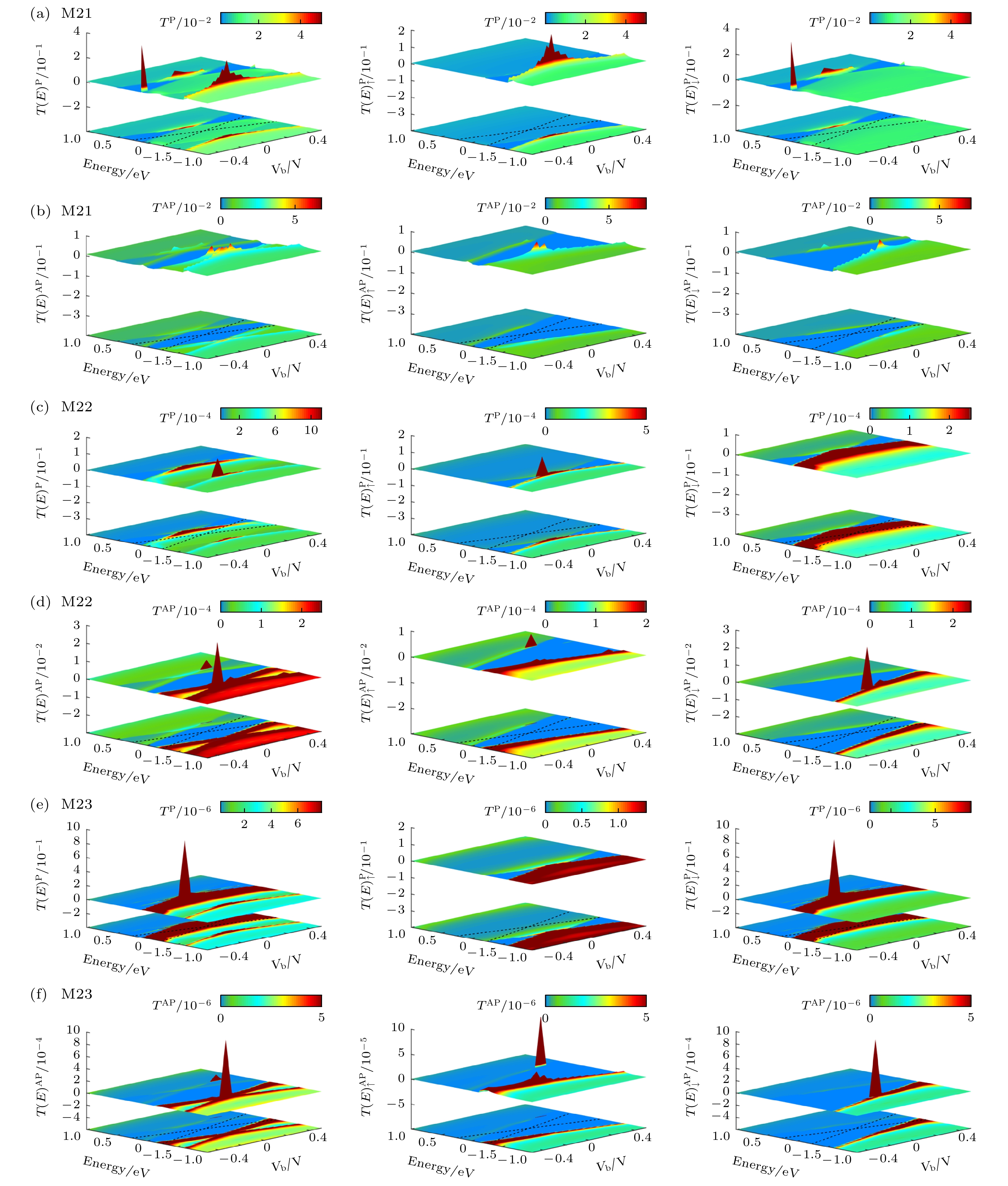 图 8 器件M1n在P和AP构型下的自旋相关透射谱, 虚线表示偏压窗 (a) M11, (c) M12和 (e) M13在P构型下的透射谱; (b) M11, (d) M12和 (f) M13在AP构型下的透射谱