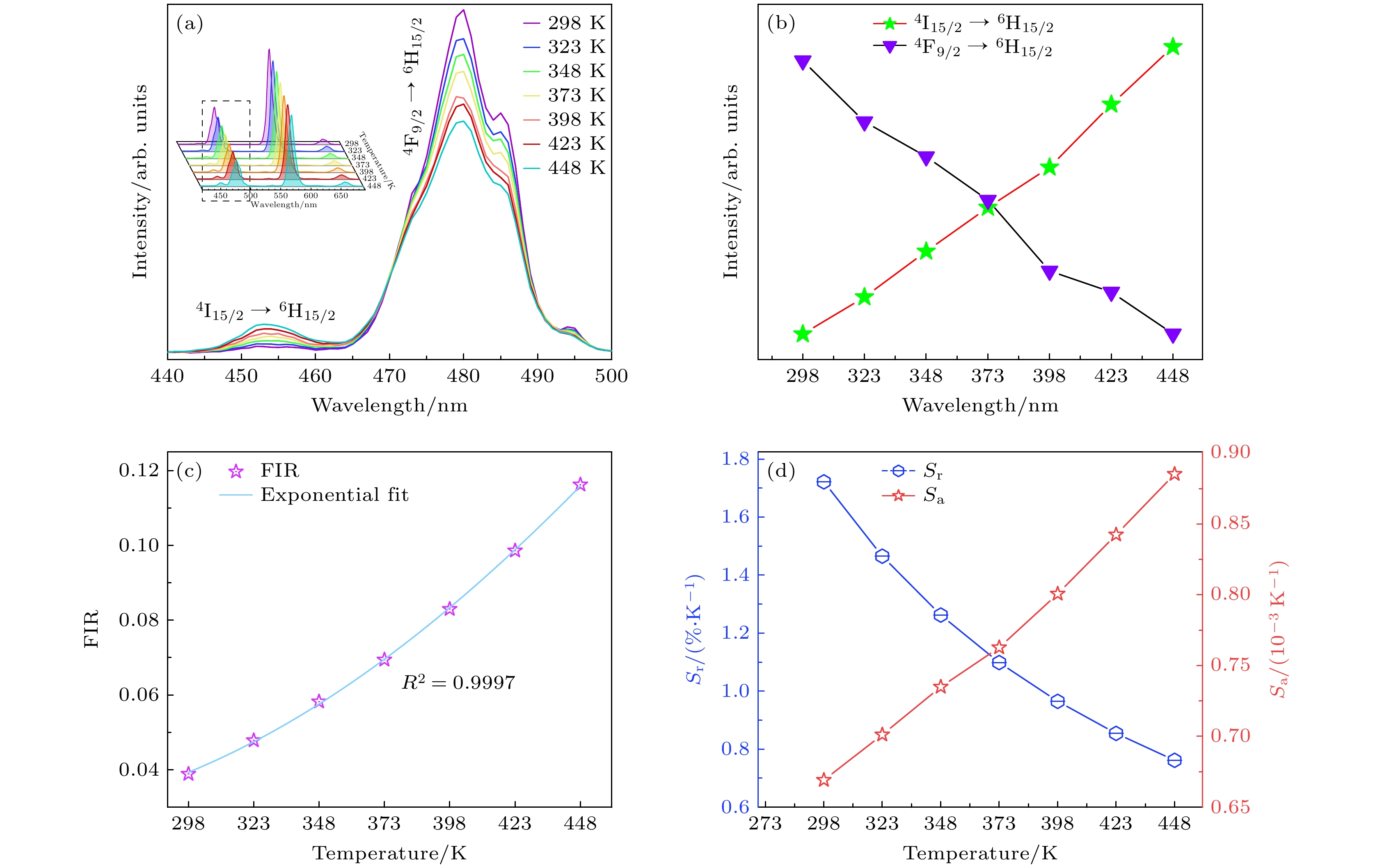 Figure 11. (a) Emission spectra of the CNYP: 0.07 Dy3+ phosphor in the wavelength range of 440–500 nm at different temperatures (298–448 K); (b) the luminous intensity changes of the 4I15/2→6H15/2 and 4F9/2→6H15/2; (c) fluorescence intensity ratio as a function of temperatures; (d) absolute sensitivity and relative sensitivity as a function of temperatures.