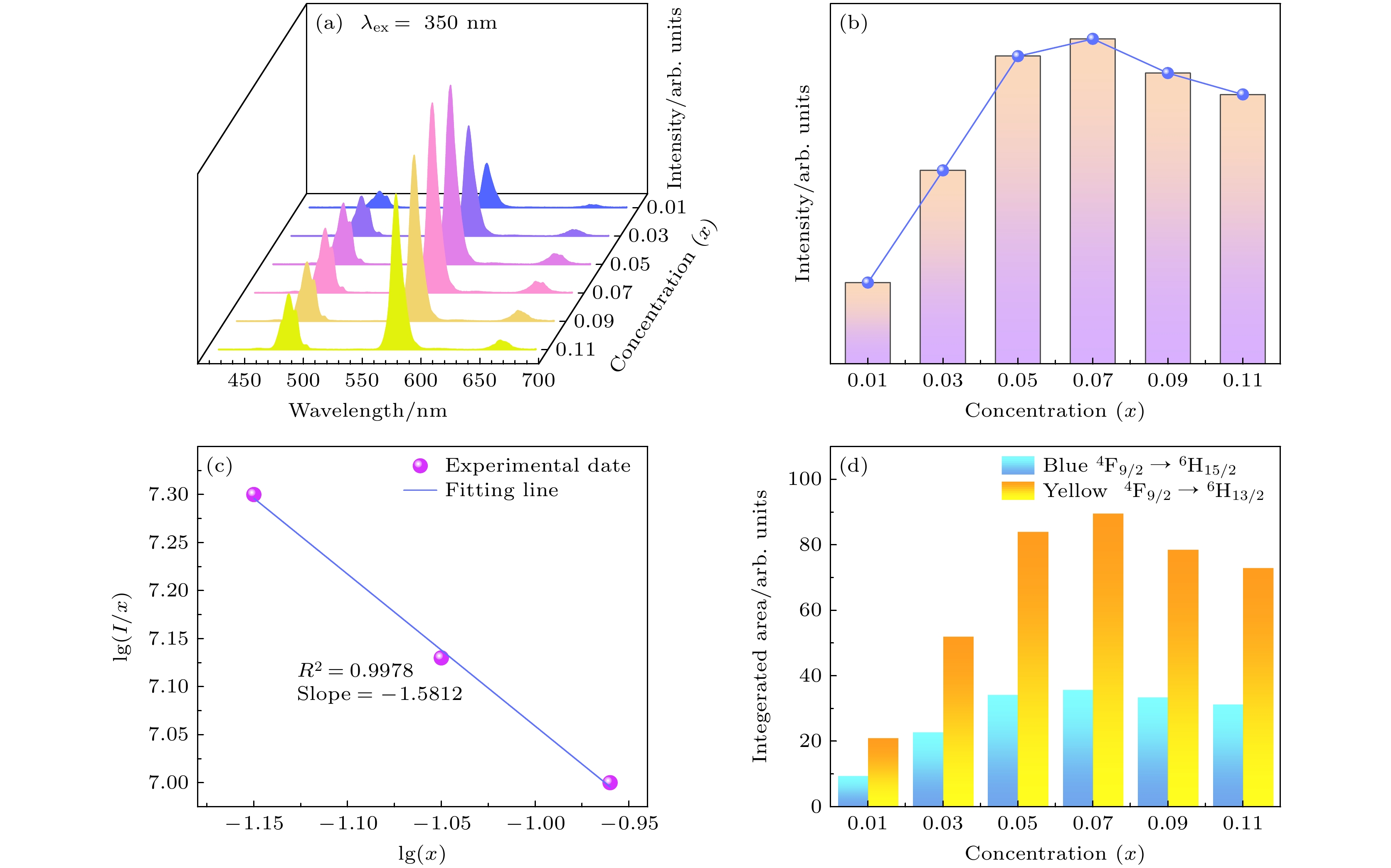 Figure 4. (a) Photoluminescence emission spectra of CNYP: xDy3+ (x = 0.01–0.11) (λex = 350 nm); (b) the histogram between integrated emission intensity and Dy3+ concentration; (c) linear fitting diagram of lg(I/x) and lg(x); (d) relative luminescence intensity at 480 nm and 571 nm.