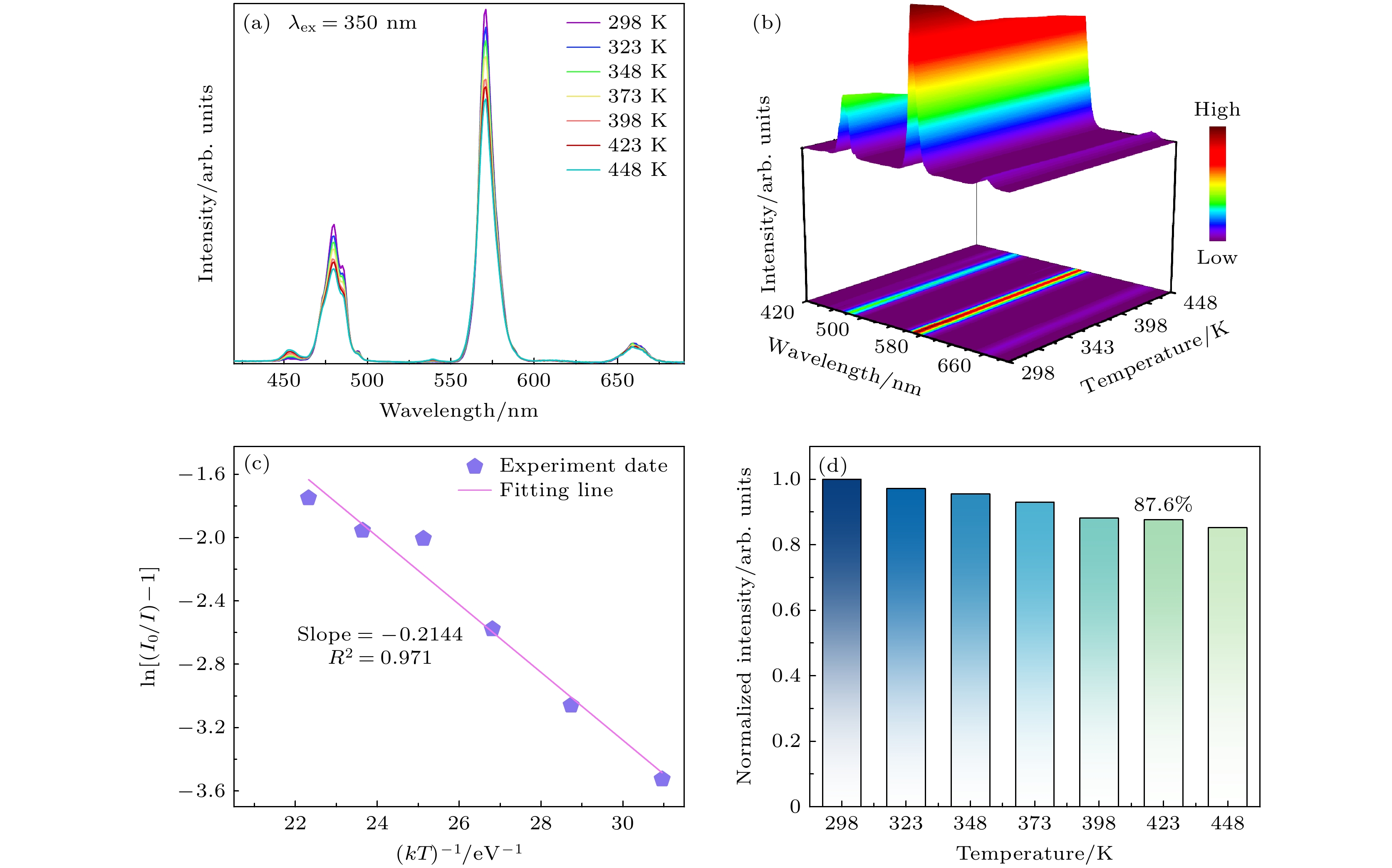 Figure 8. (a) Emission spectra of CNYP: 0.07Dy3+ phosphors at different temperatures; (b) 3D graph of fluorescence intensity; (c) the linear fitting relationship between ln[(I0/I) – 1] and 1/(kT); (d) bar chart of normalized luminous intensity varying with temperatures.