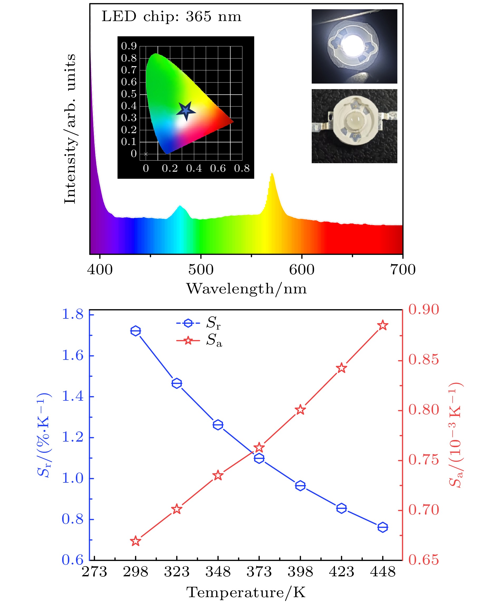 No. Concentration x y CCT/K 1 0.01 0.3897 0.4375 4219 2 0.03 0.3846 0.4457 4130 3 0.05 0.3894 0.4510 4033 4 0.07 0.3905 0.4529 4015 5 0.09 0.3872 0.4483 4075 6 0.11 0.3865 0.4482 4093 表 2 以FIR技术为基础的温敏型Dy3+激活荧光粉的最大Sr值比较