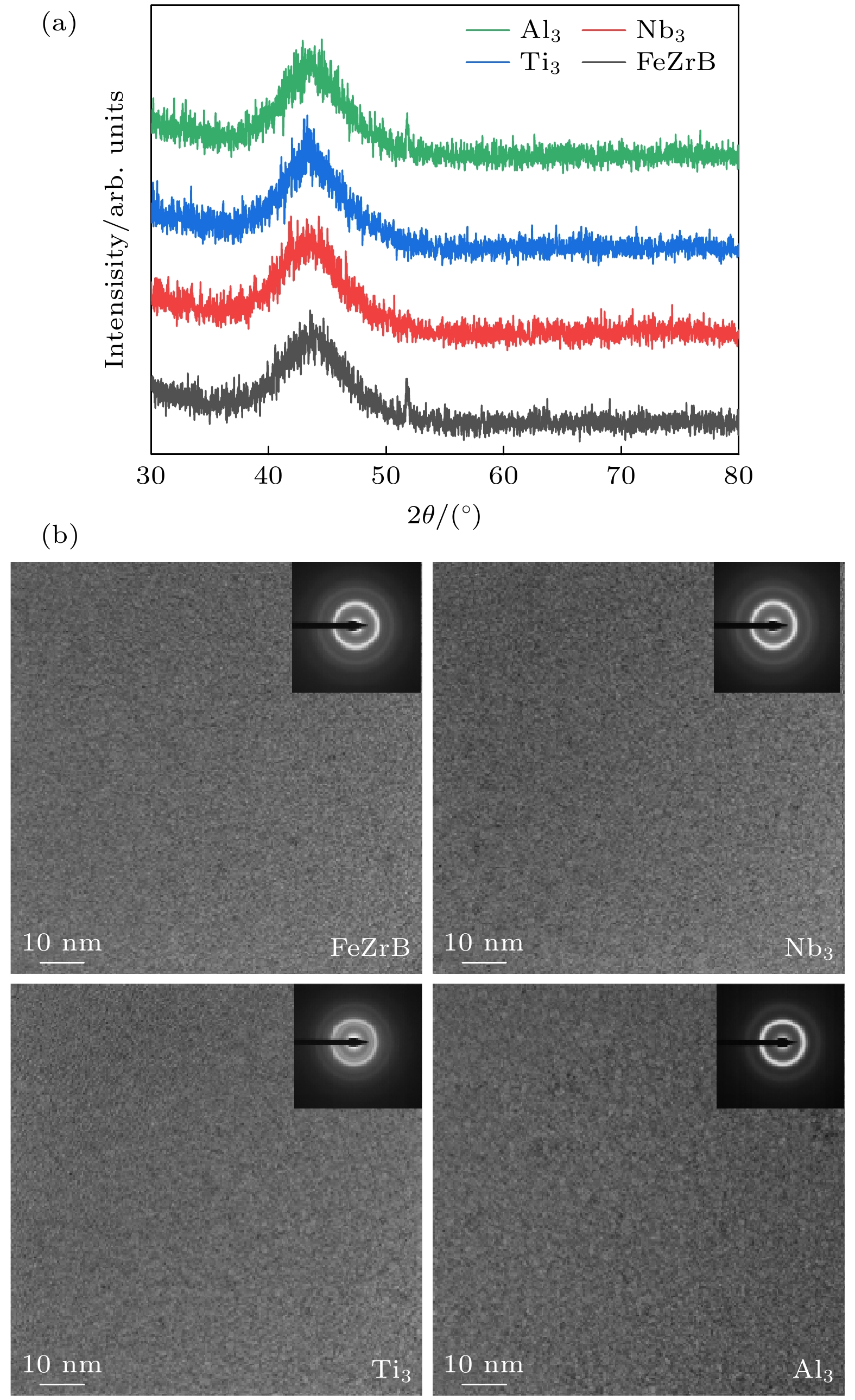 图 1 (Fe0.84Zr0.09B0.07)100–xMx (x = 0, 3; M = Nb, Ti, Al)金属玻璃条带的(a) XRD曲线和(b) HRTEM图像, 插图为相应的选区电子衍射图像