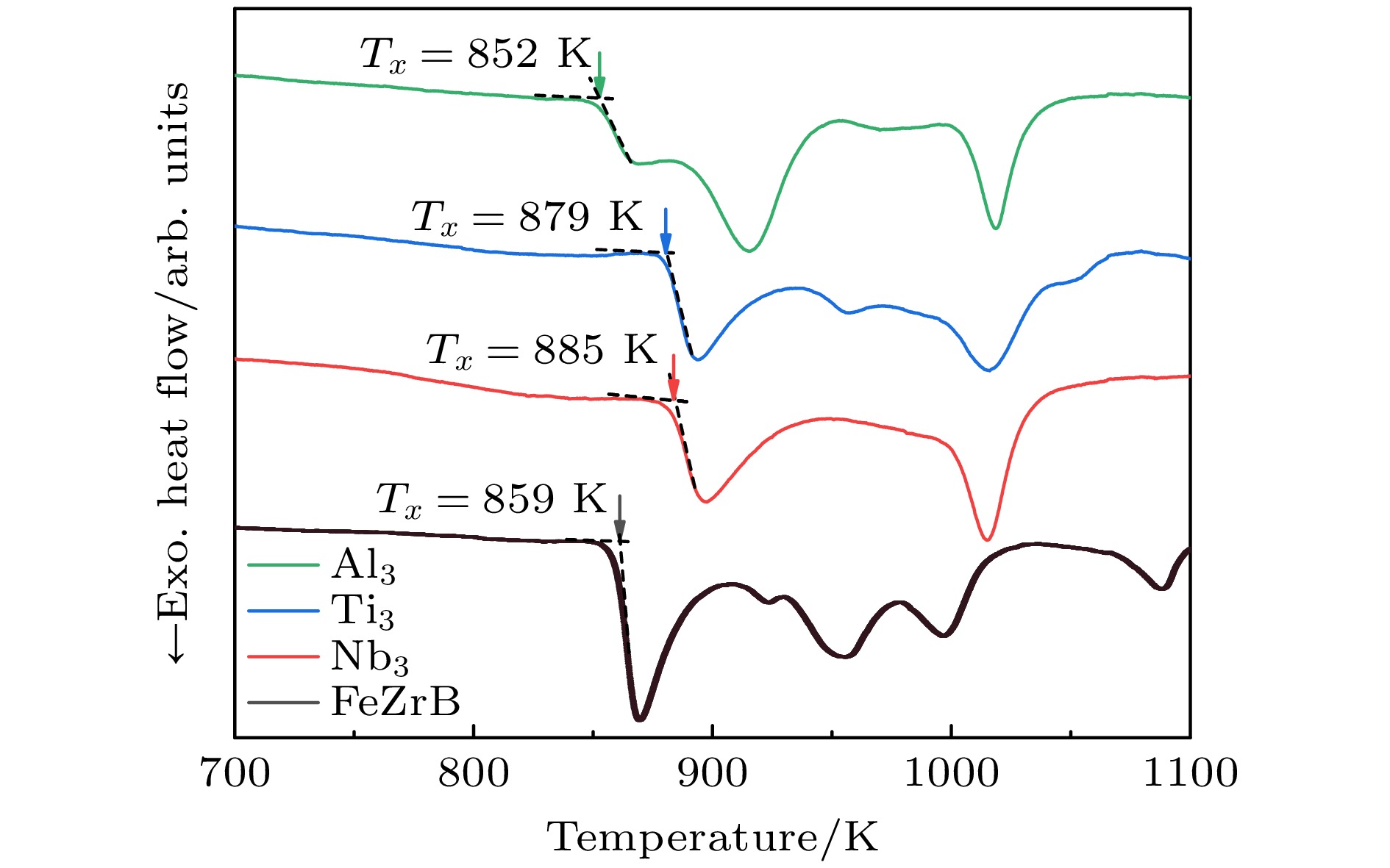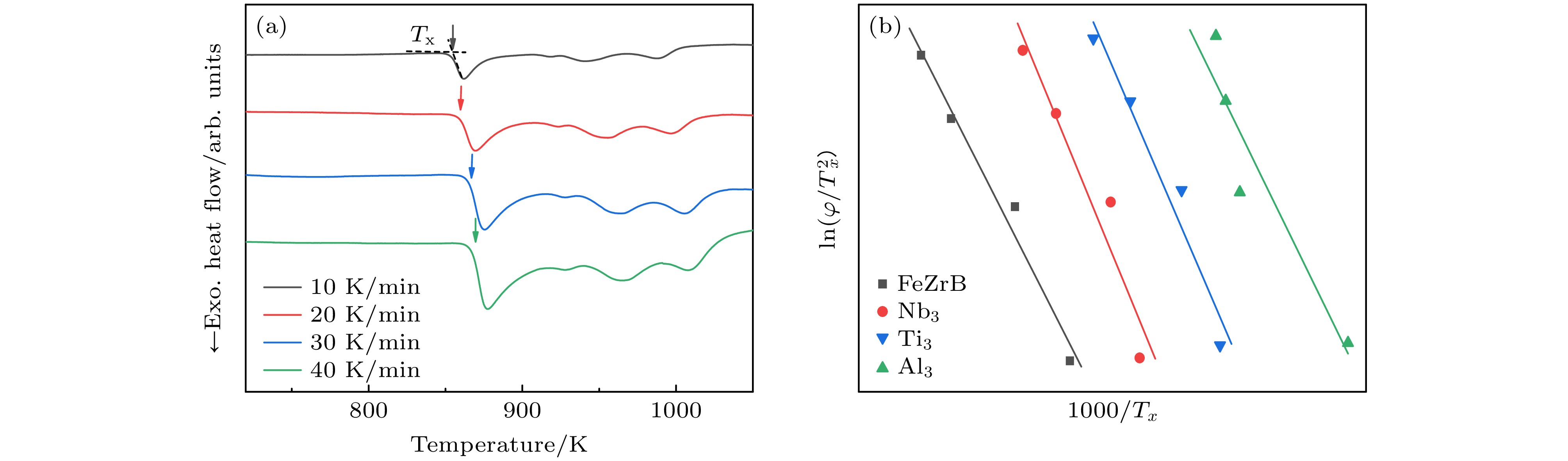 成分 高温脆性m' E/(kJ·mol–1) R2 过冷液体脆性系数m Fe84Zr9B7 129.3 413.8 0.976 25.2 (Fe0.84Zr0.09B0.07)97Nb3 127.6 512.3 0.962 30.3 (Fe0.84Zr0.09B0.07)97Ti3 — 489.5 0.976 29.1 (Fe0.84Zr0.09B0.07)97Al3 126.7 436.6 0.90 26.4 表 2 (Fe0.84Zr0.09B0.07)100-xMx (x = 0, 3; M = Nb, Ti, Al)金属玻璃条带在不同升温速率(10—40 K/min)下的初始晶化温度Tx