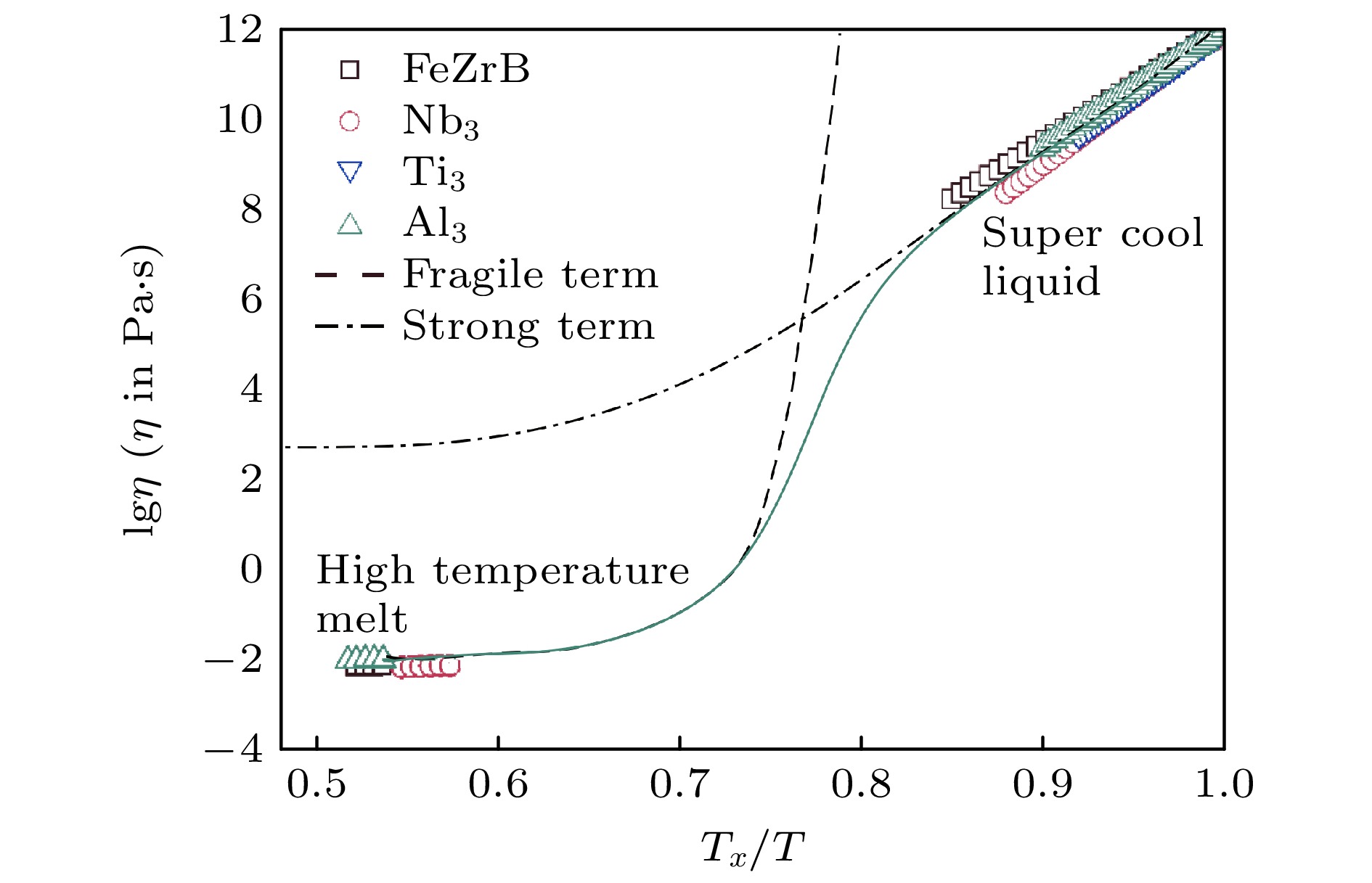 Table 1. Fragility index for high temperature (m′) liquid and supercooled liquid (m) of (Fe0.84Zr0.09B0.07)100–xMx (x = 0, 3; M = Nb, Ti, Al).